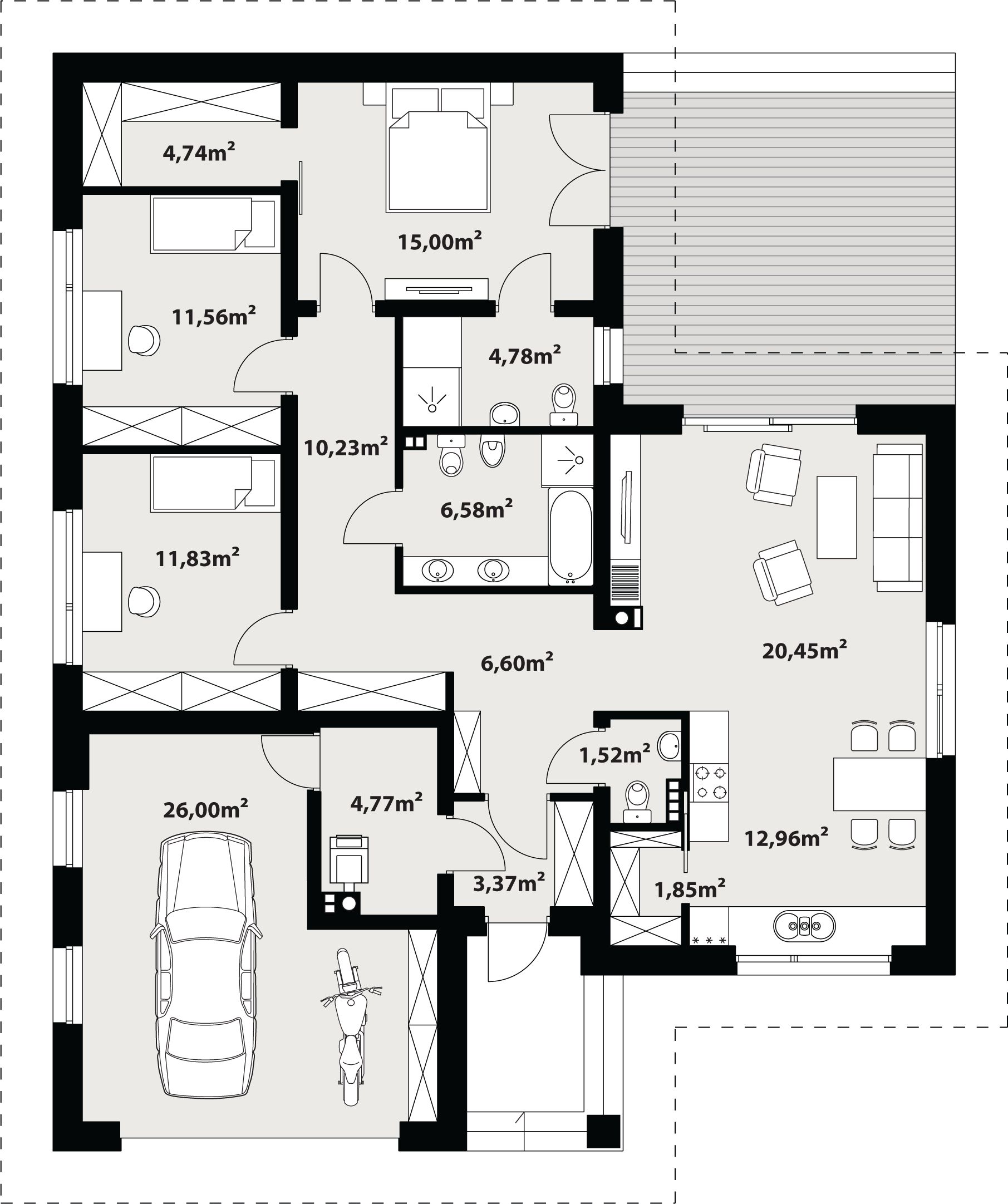 Graficzne opracowanie rzutów poglądowych widocznych na karcie projektu zostało wykonane przez Extradom.pl. Prezentowane przez Extradom.pl wizualizacje wykonane zostały przez autora projektu i należy poczytywać je jedynie za przykład i propozycję wykończenia, wizję architektoniczną autora projektu. Ostateczne wykończenie budynku może nastąpić na wiele sposobów. Szczegółowe rozwiązania zastosowane w oferowanej dokumentacji - w tym również ilość, lokalizacje i wygląd okien, drzwi, kominów - mogą w niewielkim stopniu różnić się od prezentowanej wizualizacji budynku.