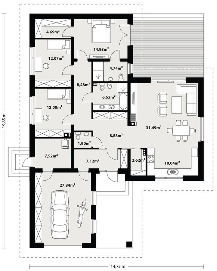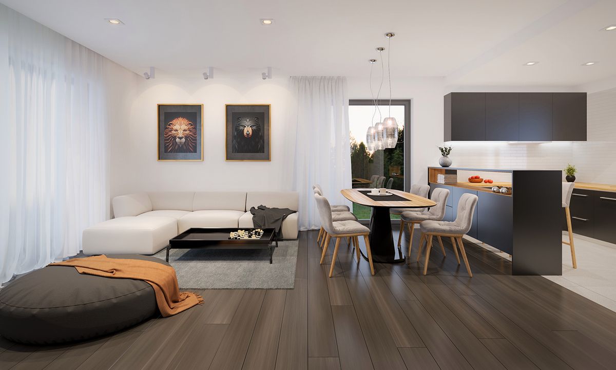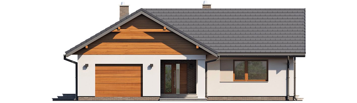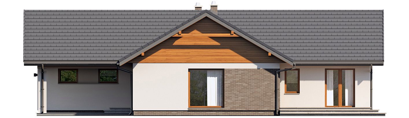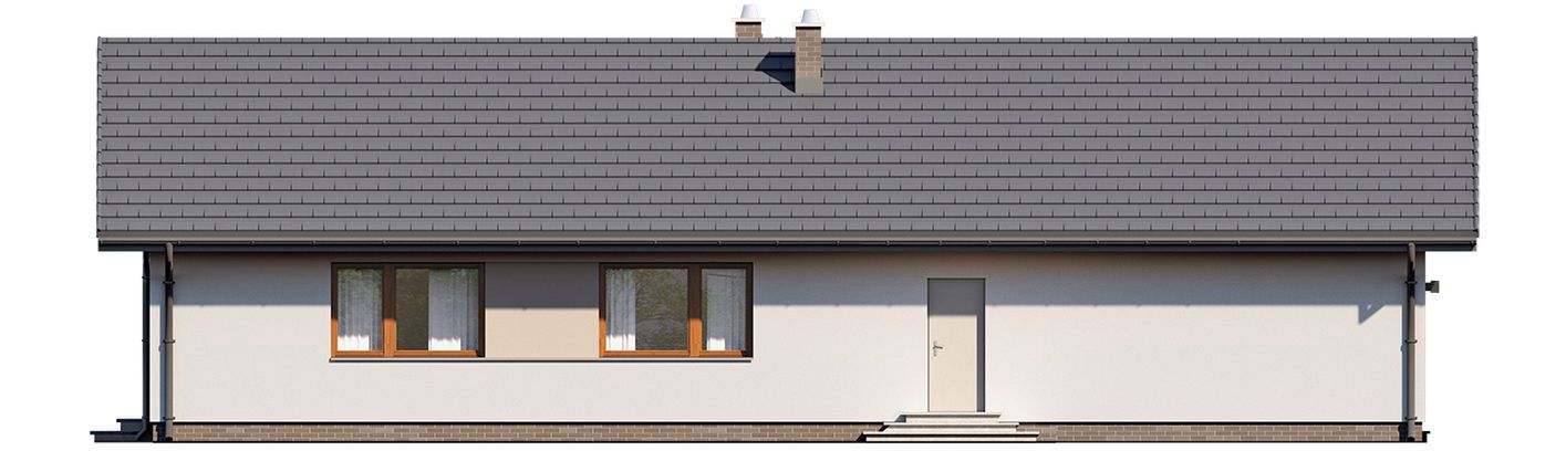 Graficzne opracowanie rzutów poglądowych widocznych na karcie projektu zostało wykonane przez Extradom.pl. Prezentowane przez Extradom.pl wizualizacje wykonane zostały przez autora projektu i należy poczytywać je jedynie za przykład i propozycję wykończenia, wizję architektoniczną autora projektu. Ostateczne wykończenie budynku może nastąpić na wiele sposobów. Szczegółowe rozwiązania zastosowane w oferowanej dokumentacji - w tym również ilość, lokalizacje i wygląd okien, drzwi, kominów - mogą w niewielkim stopniu różnić się od prezentowanej wizualizacji budynku.