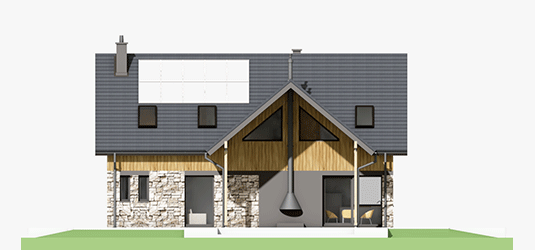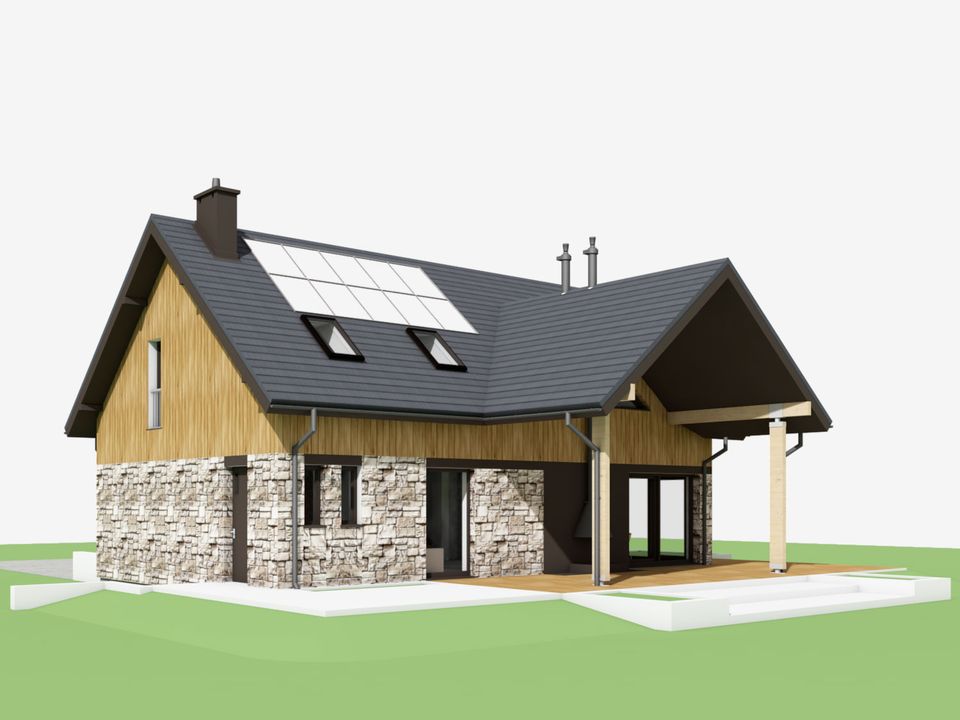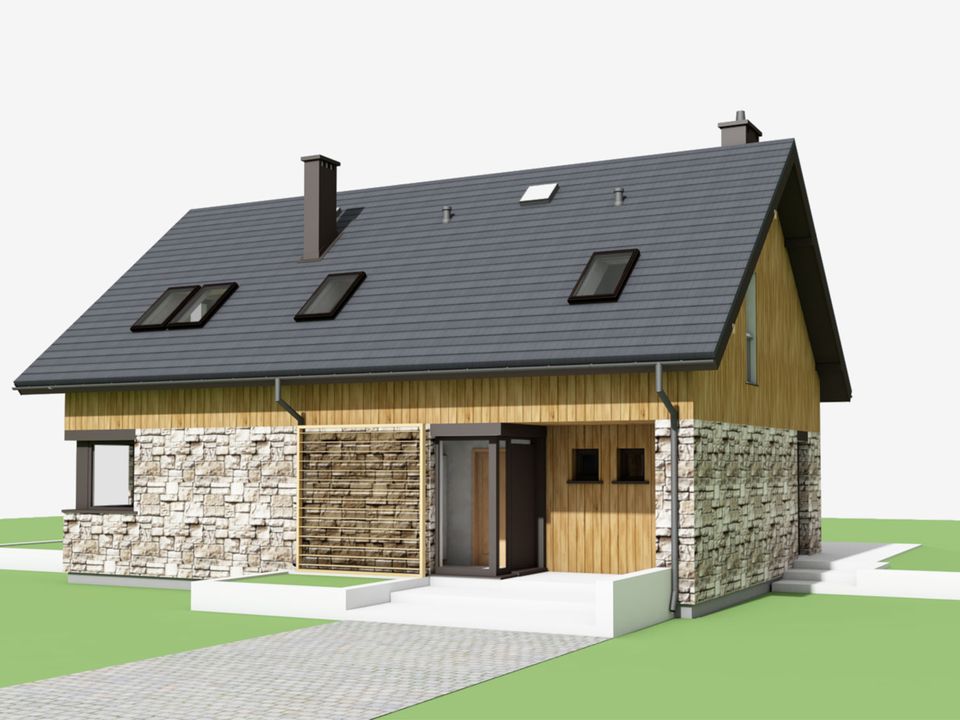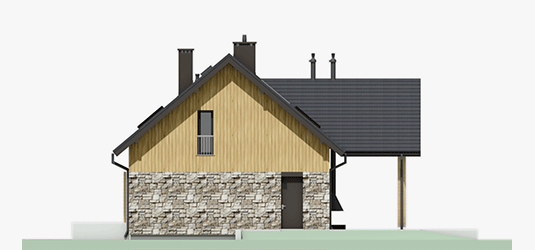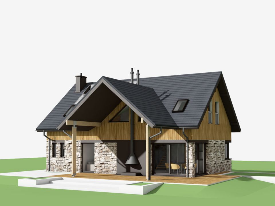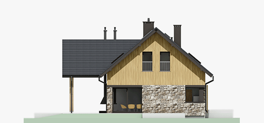 Graficzne opracowanie rzutów poglądowych widocznych na karcie projektu zostało wykonane przez Extradom.pl. Prezentowane przez Extradom.pl wizualizacje wykonane zostały przez autora projektu i należy poczytywać je jedynie za przykład i propozycję wykończenia, wizję architektoniczną autora projektu. Ostateczne wykończenie budynku może nastąpić na wiele sposobów. Szczegółowe rozwiązania zastosowane w oferowanej dokumentacji - w tym również ilość, lokalizacje i wygląd okien, drzwi, kominów - mogą w niewielkim stopniu różnić się od prezentowanej wizualizacji budynku.