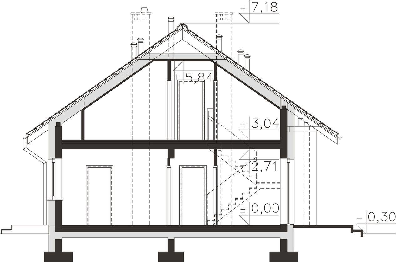 Fundamenty - rozwiązanie o podwyższonej izolacji termicznej. Ściany zewnętrzne - Bloczek silikatowy 24 cm + styropian 25 cm. Strop - żelbetowy. Dach - tradycyjna więźba ciesielska. Ogrzewanie - c.o. podłogowe + c.w.u. - kocioł gazowy Ogrzewanie - Wersja na zmówienie: c.o.+c.w.u. pompa ciepła powietrze woda. Wentylacja - grawitacyjna.