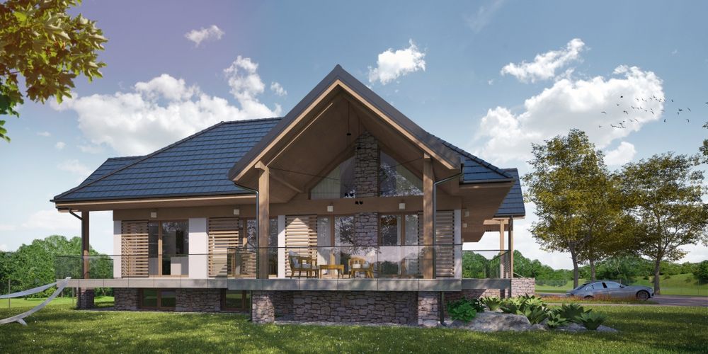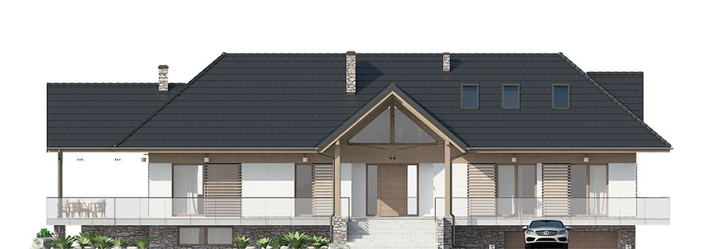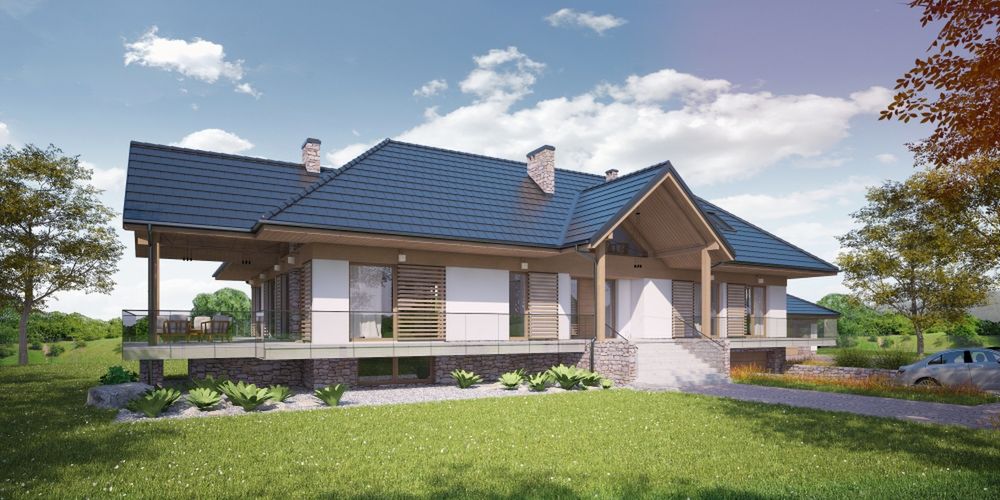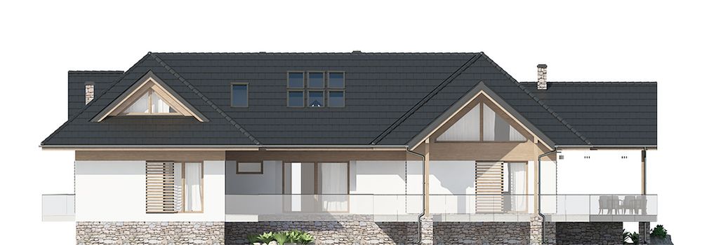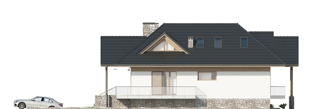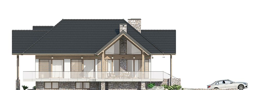 Graficzne opracowanie rzutów poglądowych widocznych na karcie projektu zostało wykonane przez Extradom.pl. Prezentowane przez Extradom.pl wizualizacje wykonane zostały przez autora projektu i należy poczytywać je jedynie za przykład i propozycję wykończenia, wizję architektoniczną autora projektu. Ostateczne wykończenie budynku może nastąpić na wiele sposobów. Szczegółowe rozwiązania zastosowane w oferowanej dokumentacji - w tym również ilość, lokalizacje i wygląd okien, drzwi, kominów - mogą w niewielkim stopniu różnić się od prezentowanej wizualizacji budynku.