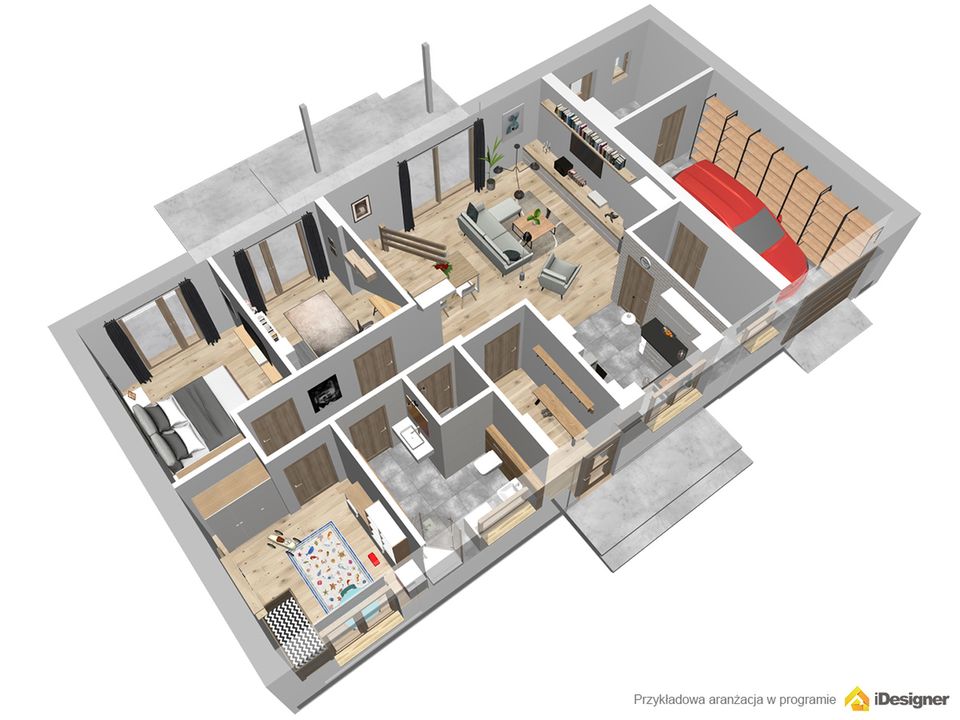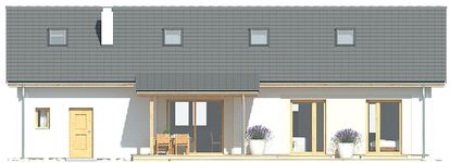 Graficzne opracowanie rzutów poglądowych widocznych na karcie projektu zostało wykonane przez Extradom.pl. Prezentowane przez Extradom.pl wizualizacje wykonane zostały przez autora projektu i należy poczytywać je jedynie za przykład i propozycję wykończenia, wizję architektoniczną autora projektu. Ostateczne wykończenie budynku może nastąpić na wiele sposobów. Szczegółowe rozwiązania zastosowane w oferowanej dokumentacji - w tym również ilość, lokalizacje i wygląd okien, drzwi, kominów - mogą w niewielkim stopniu różnić się od prezentowanej wizualizacji budynku.