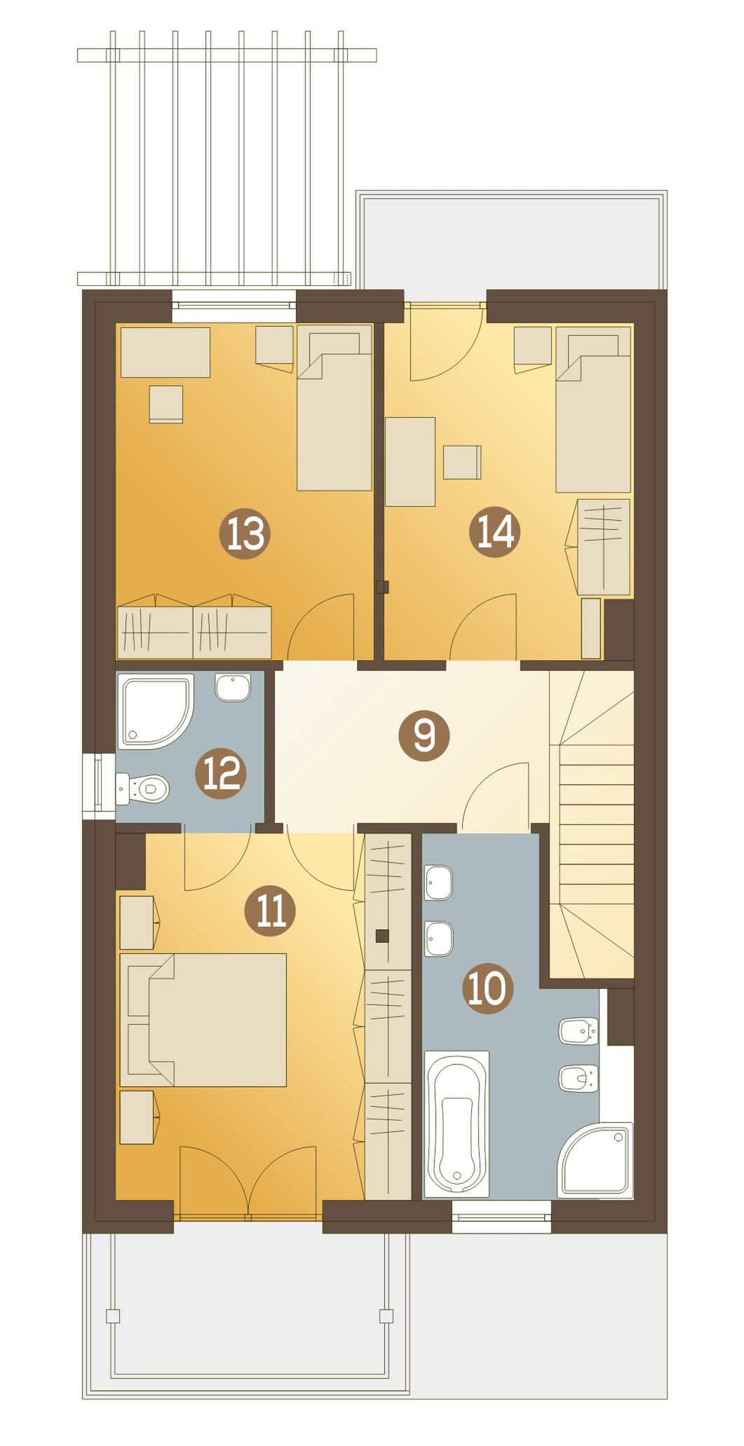 Graficzne opracowanie rzutów poglądowych widocznych na karcie projektu zostało wykonane przez Extradom.pl. Prezentowane przez Extradom.pl wizualizacje wykonane zostały przez autora projektu i należy poczytywać je jedynie za przykład i propozycję wykończenia, wizję architektoniczną autora projektu. Ostateczne wykończenie budynku może nastąpić na wiele sposobów. Szczegółowe rozwiązania zastosowane w oferowanej dokumentacji - w tym również ilość, lokalizacje i wygląd okien, drzwi, kominów - mogą w niewielkim stopniu różnić się od prezentowanej wizualizacji budynku.