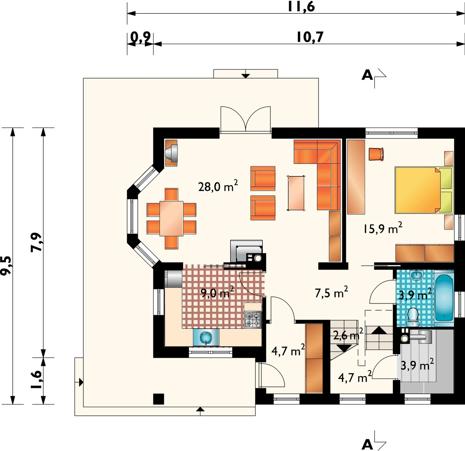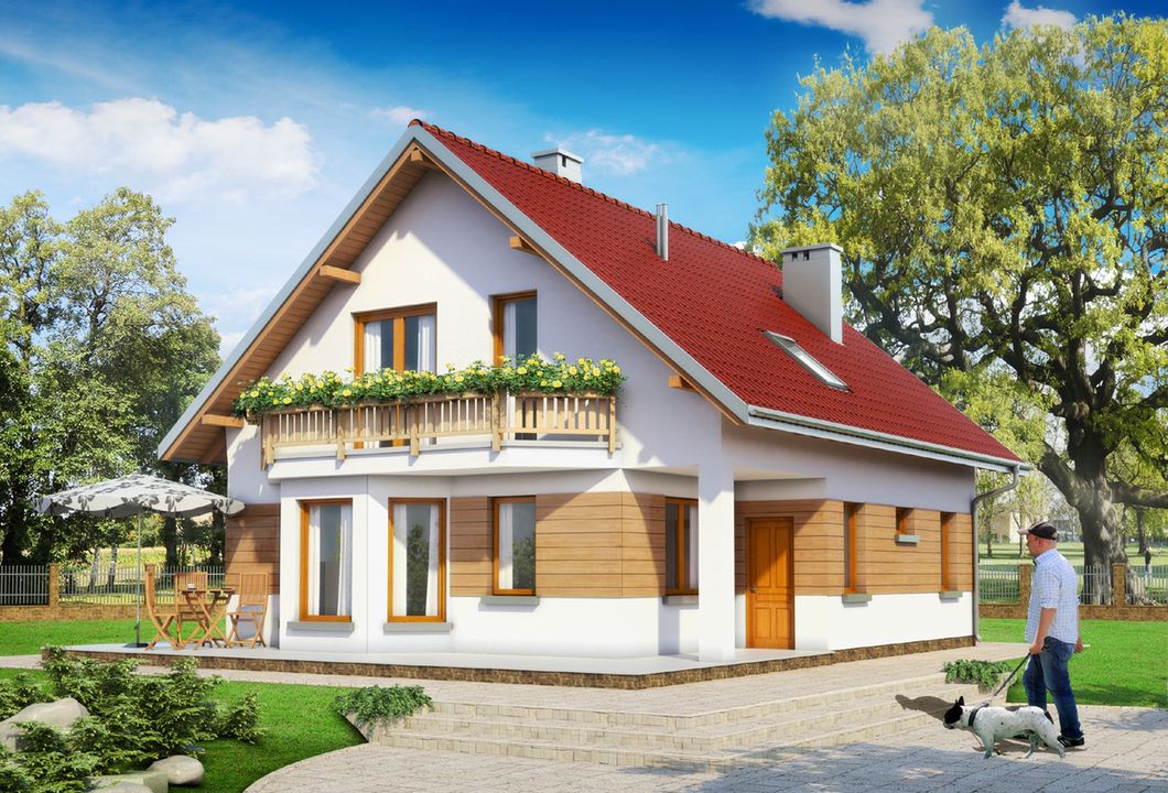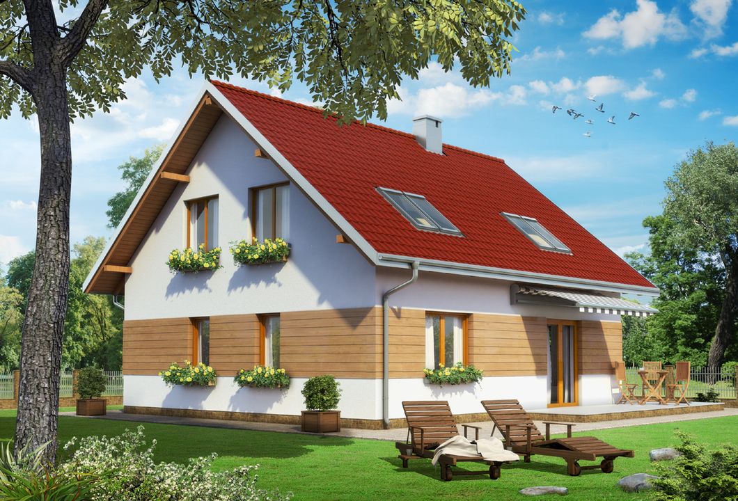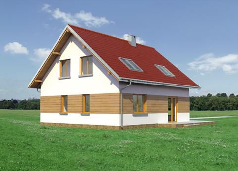Graficzne opracowanie rzutów poglądowych widocznych na karcie projektu zostało wykonane przez Extradom.pl. Prezentowane przez Extradom.pl wizualizacje wykonane zostały przez autora projektu i należy poczytywać je jedynie za przykład i propozycję wykończenia, wizję architektoniczną autora projektu. Ostateczne wykończenie budynku może nastąpić na wiele sposobów. Szczegółowe rozwiązania zastosowane w oferowanej dokumentacji - w tym również ilość, lokalizacje i wygląd okien, drzwi, kominów - mogą w niewielkim stopniu różnić się od prezentowanej wizualizacji budynku.