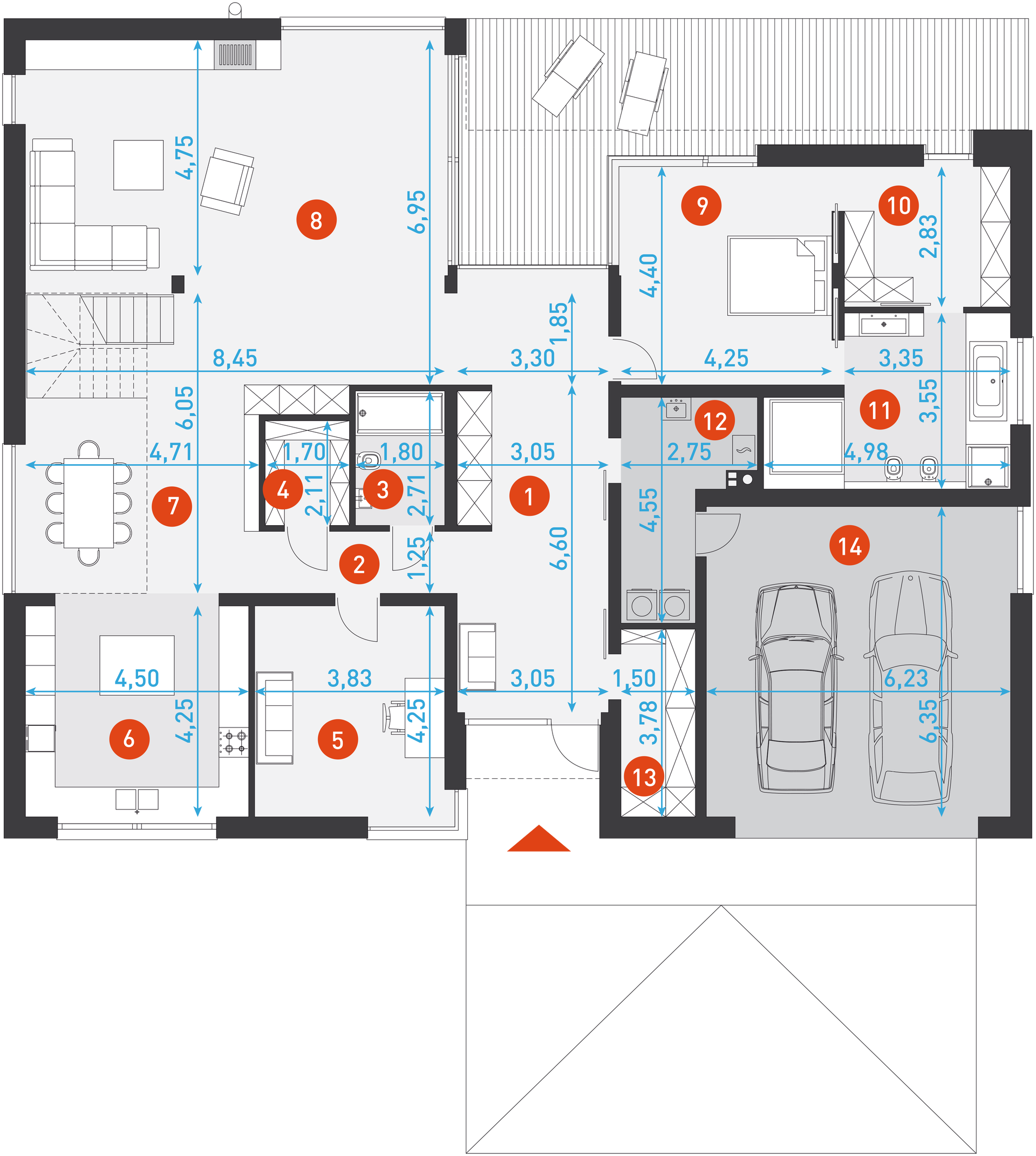 Fundamenty: tradycyjne - ławy i stopy żelbetowe. Ściany: bloczek silikatowy + styropian - na etapie adaptacji projektu istnieje możliwość zamiany bloczka silikatowego na inny materiał o podobnych parametrach wytrzymałosciowych, np. na pustak ceramiczny. Elewacja: tynk, blacha na rąbek, deska elewacyjna - deskę elewacyjną wykorzystaną jako materiał dekoracyjny można zamienić na etapie adaptacji projektu na inny, np. na płytkę klinkierową. Stropy: żelbetowe wylewane - na etapie adaptacji projektu istnieje możliwość zmiany technologii stropu na gęstożebrowy lub prefabrykowany. Schody: konstrukcji lekkiej - konstrukcja oraz materiały wykończeniowe schodów przewidziane do indywidualnej aranżacji. Dach: blacha na rąbek - konstrukcja więźby przewidziana pod pokrycie lekkie dla I strefy wiatrowej i II strefy śniegowej.
