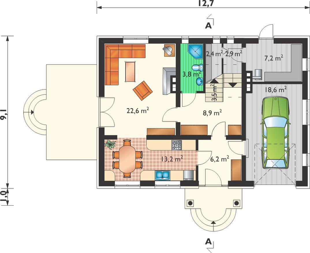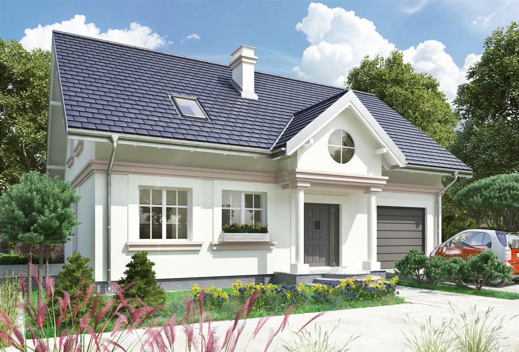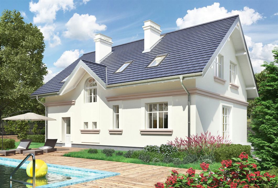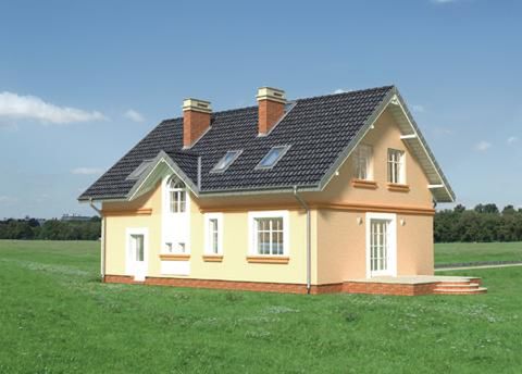 Graficzne opracowanie rzutów poglądowych widocznych na karcie projektu zostało wykonane przez Extradom.pl. Prezentowane przez Extradom.pl wizualizacje wykonane zostały przez autora projektu i należy poczytywać je jedynie za przykład i propozycję wykończenia, wizję architektoniczną autora projektu. Ostateczne wykończenie budynku może nastąpić na wiele sposobów. Szczegółowe rozwiązania zastosowane w oferowanej dokumentacji - w tym również ilość, lokalizacje i wygląd okien, drzwi, kominów - mogą w niewielkim stopniu różnić się od prezentowanej wizualizacji budynku.