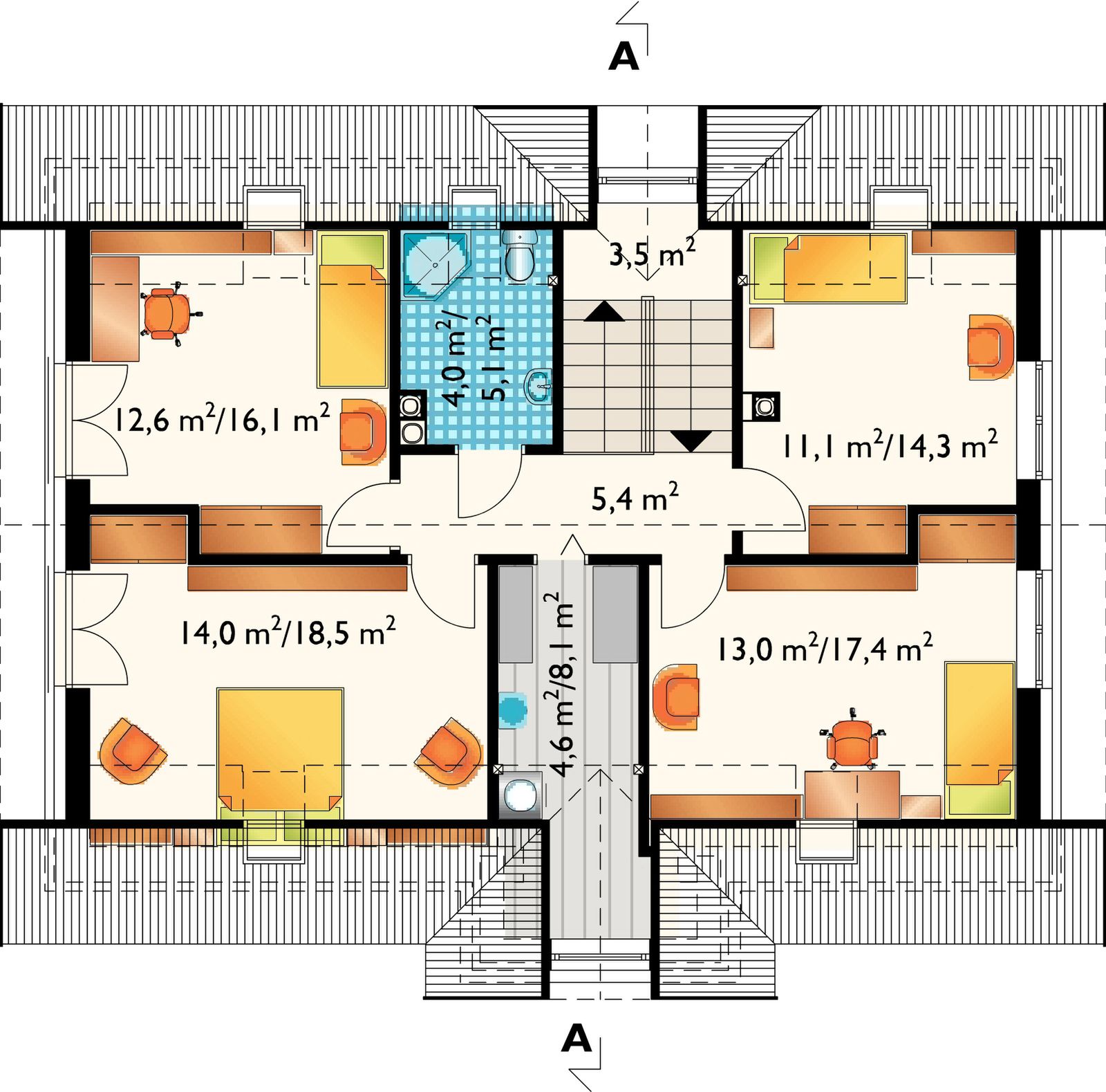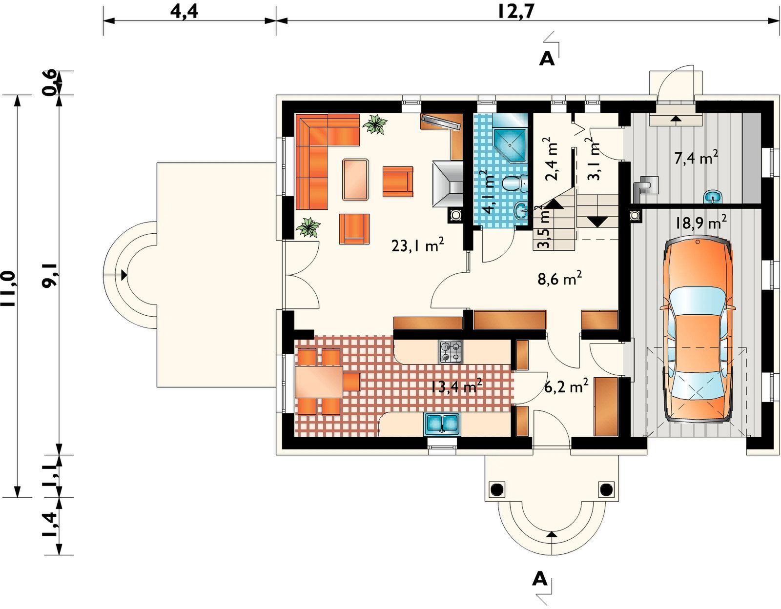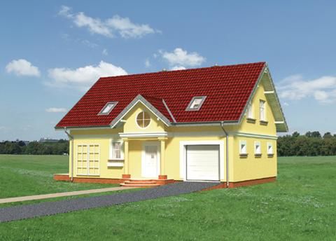 Graficzne opracowanie rzutów poglądowych widocznych na karcie projektu zostało wykonane przez Extradom.pl. Prezentowane przez Extradom.pl wizualizacje wykonane zostały przez autora projektu i należy poczytywać je jedynie za przykład i propozycję wykończenia, wizję architektoniczną autora projektu. Ostateczne wykończenie budynku może nastąpić na wiele sposobów. Szczegółowe rozwiązania zastosowane w oferowanej dokumentacji - w tym również ilość, lokalizacje i wygląd okien, drzwi, kominów - mogą w niewielkim stopniu różnić się od prezentowanej wizualizacji budynku.