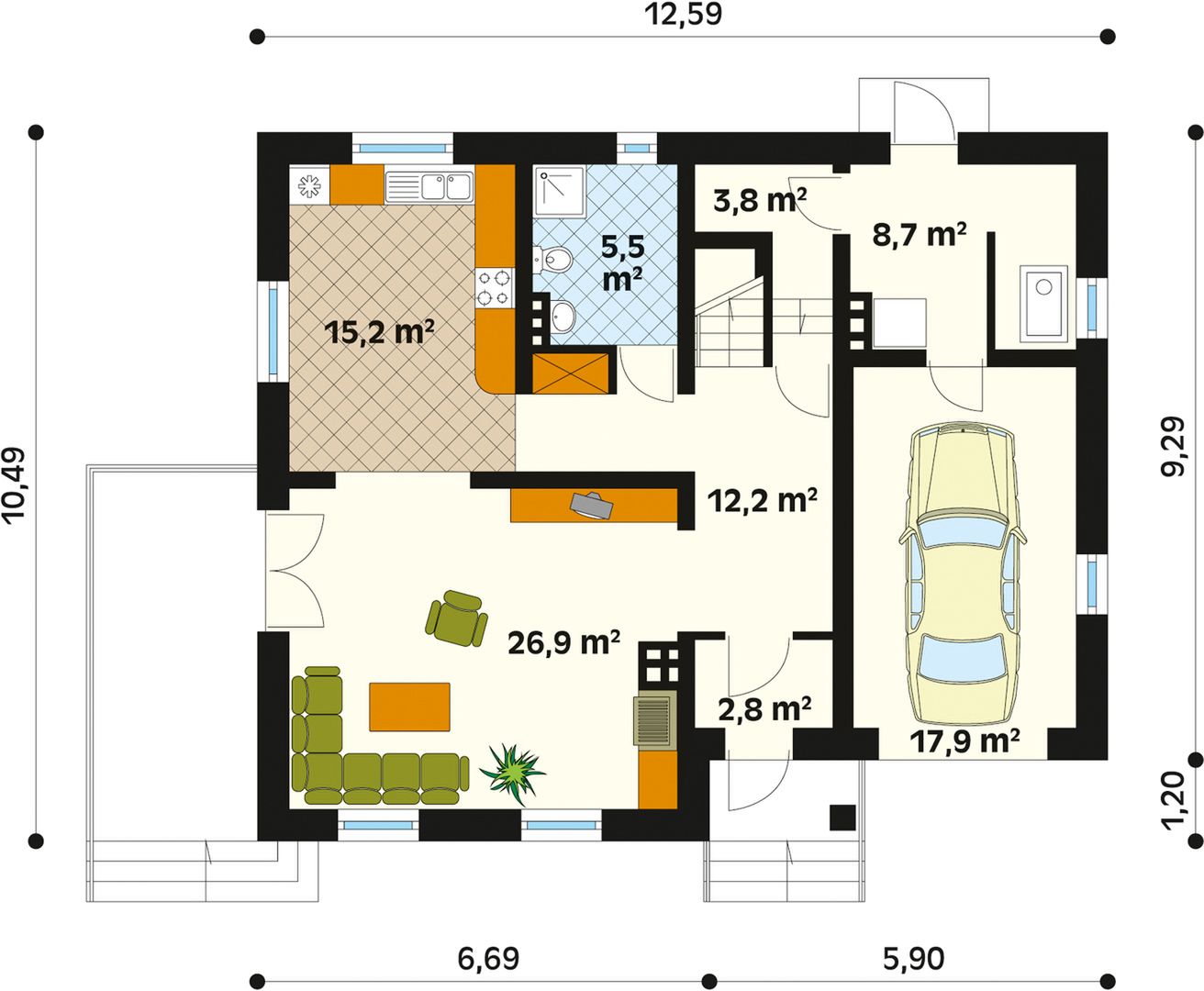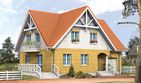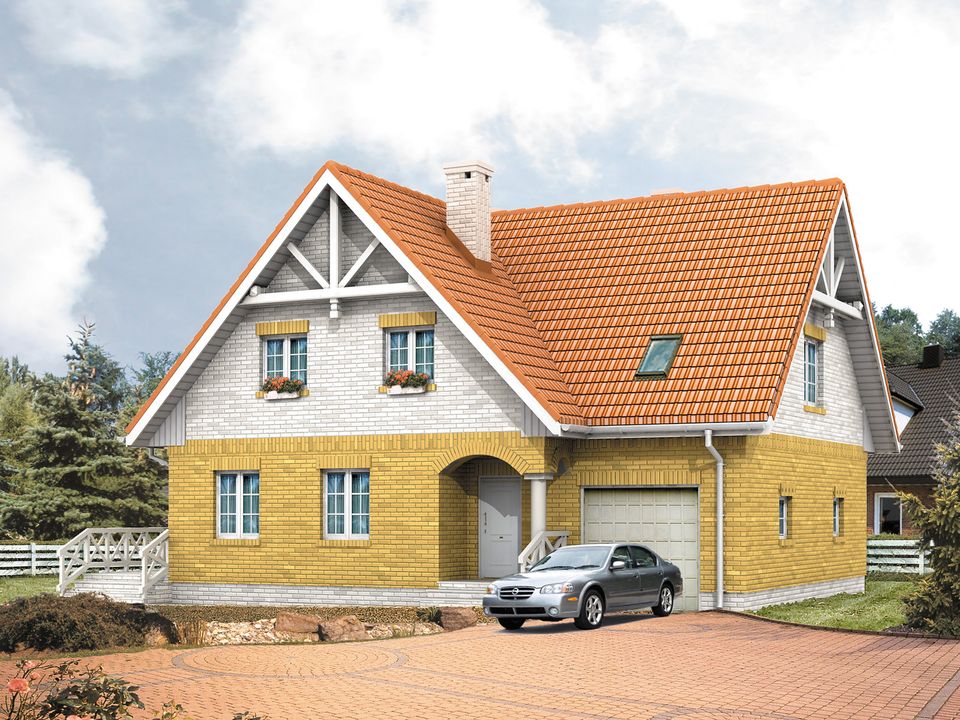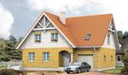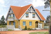 Graficzne opracowanie rzutów poglądowych widocznych na karcie projektu zostało wykonane przez Extradom.pl. Prezentowane przez Extradom.pl wizualizacje wykonane zostały przez autora projektu i należy poczytywać je jedynie za przykład i propozycję wykończenia, wizję architektoniczną autora projektu. Ostateczne wykończenie budynku może nastąpić na wiele sposobów. Szczegółowe rozwiązania zastosowane w oferowanej dokumentacji - w tym również ilość, lokalizacje i wygląd okien, drzwi, kominów - mogą w niewielkim stopniu różnić się od prezentowanej wizualizacji budynku.
