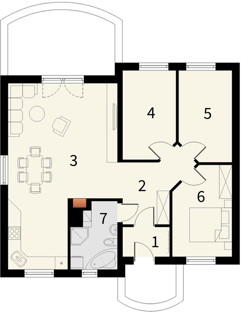 Graficzne opracowanie rzutów poglądowych widocznych na karcie projektu zostało wykonane przez Extradom.pl. Prezentowane przez Extradom.pl wizualizacje wykonane zostały przez autora projektu i należy poczytywać je jedynie za przykład i propozycję wykończenia, wizję architektoniczną autora projektu. Ostateczne wykończenie budynku może nastąpić na wiele sposobów. Szczegółowe rozwiązania zastosowane w oferowanej dokumentacji - w tym również ilość, lokalizacje i wygląd okien, drzwi, kominów - mogą w niewielkim stopniu różnić się od prezentowanej wizualizacji budynku.