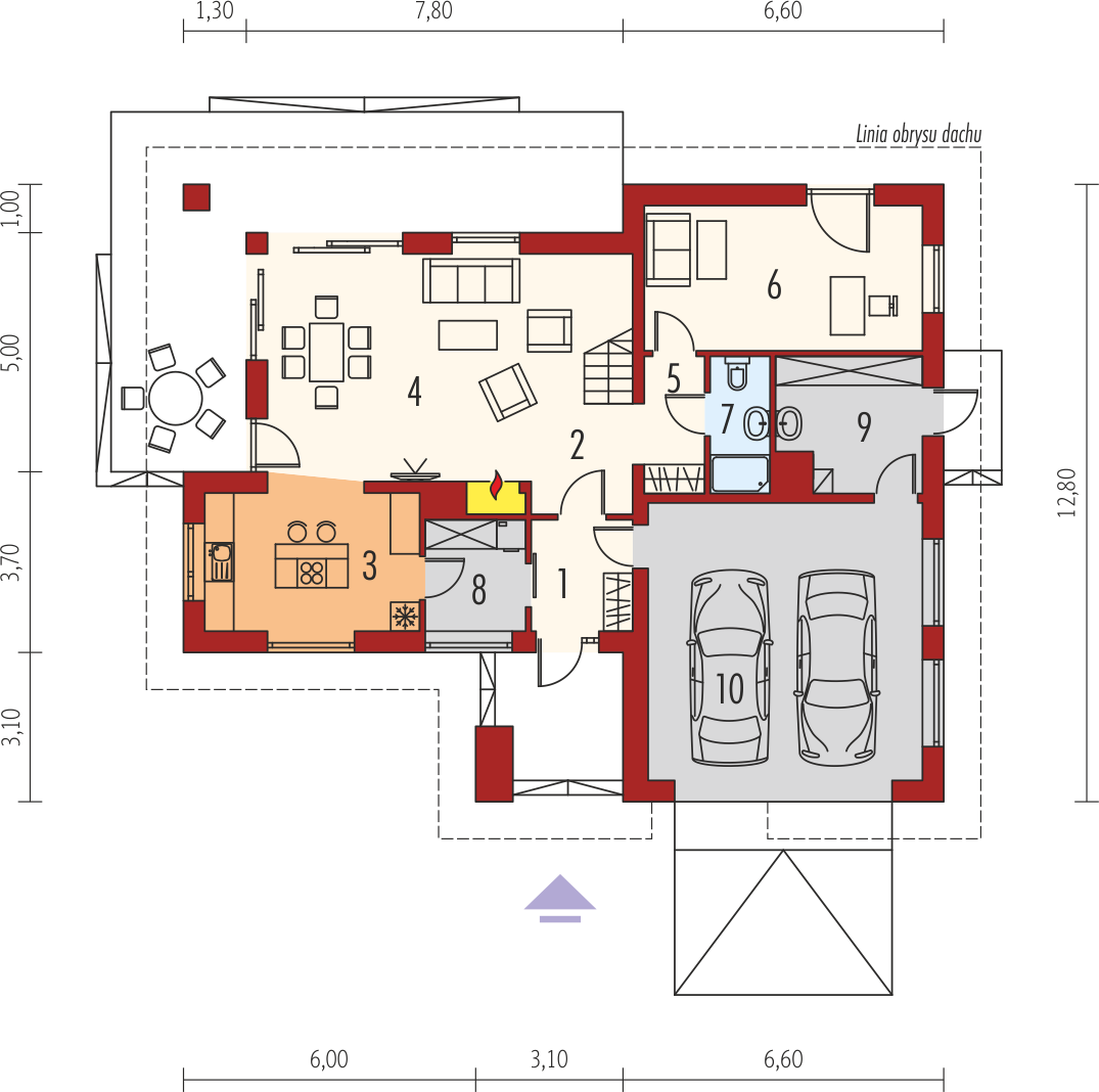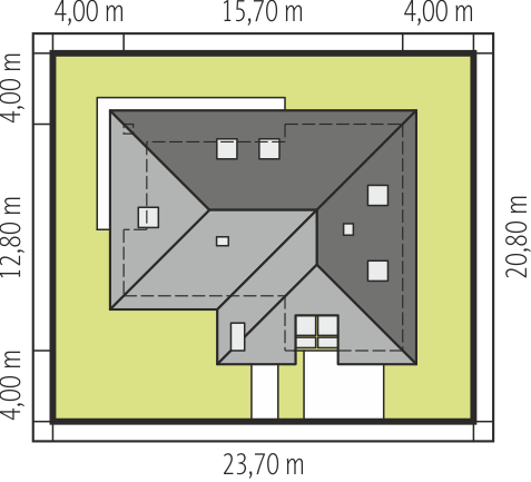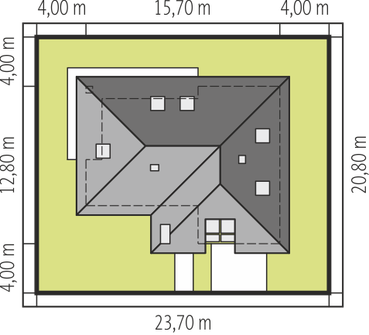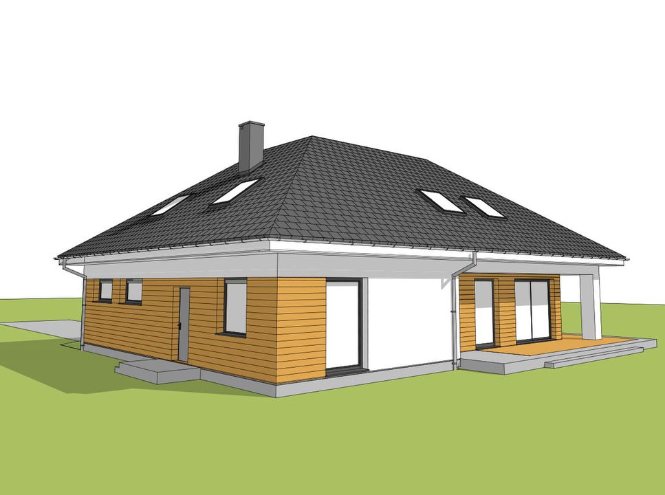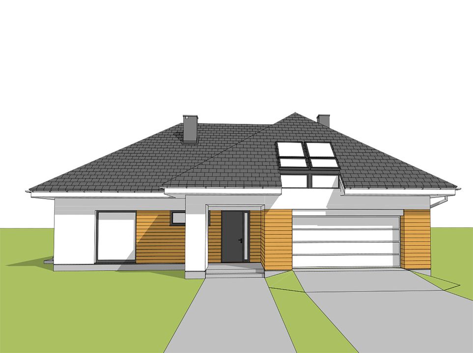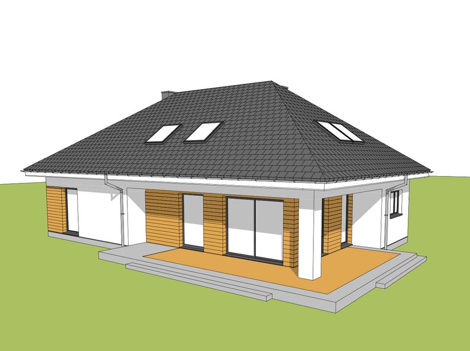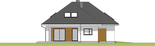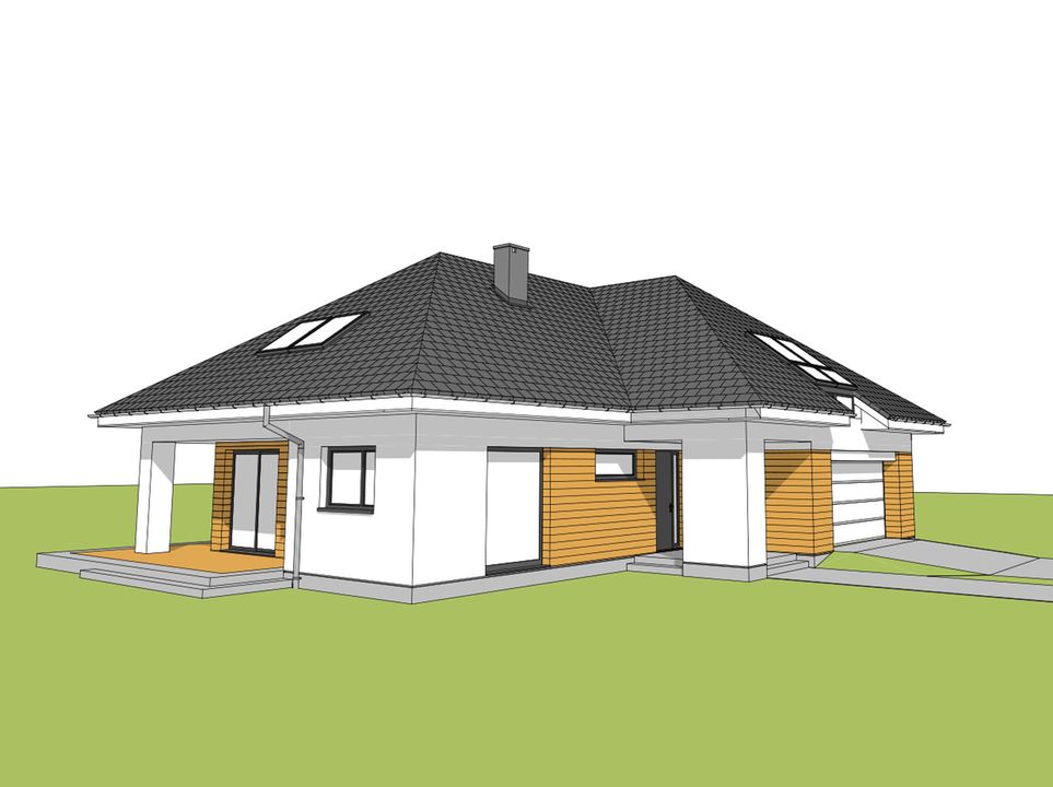 Graficzne opracowanie rzutów poglądowych widocznych na karcie projektu zostało wykonane przez Extradom.pl. Prezentowane przez Extradom.pl wizualizacje wykonane zostały przez autora projektu i należy poczytywać je jedynie za przykład i propozycję wykończenia, wizję architektoniczną autora projektu. Ostateczne wykończenie budynku może nastąpić na wiele sposobów. Szczegółowe rozwiązania zastosowane w oferowanej dokumentacji - w tym również ilość, lokalizacje i wygląd okien, drzwi, kominów - mogą w niewielkim stopniu różnić się od prezentowanej wizualizacji budynku.