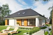 Charakterystyka: Dom parterowy z poddaszem użytkowym, niepodpiwniczony, z garażem dwustanowiskowym Przeznaczenie: Dom dla 3-5-osobowej rodzinyTechnologia. Ściany zewnętrzne: murowane, dwuwarstwowe, pustaki ceramiki poryzowanej 24 cm, ocieplenie wełna mineralna 20 cm. Ściany wewnętrzne: nośne i działowe murowane, pustaki ceramiki poryzowanej 24 cm i 11,5 cm. Strop: międzypiętrowy gęstożebrowy Teriva. Dach: konstrukcja drewniana, ocieplenie wełna mineralna Isover 30 cm, dachówka płaska Bergamo firmy Röben lub inna o podobnych parametrach. Inne: schody wewnętrzne drewnianeRozwiązania instalacje. Ogrzewanie: kocioł gazowy kondensacyjny firmy Viessmann, rozprowadzenie ciepła: grzejniki firmy Purmo. Wentylacja: grawitacyjna. OZE: kolektory słoneczne firmy Viessmann. Dodatkowo: stacja uzdatniania wody firmy Viessmann. Elewacje: tynk cienkowarstwowy mineralny i okładzina z płyty HPL z naturalną okleiną drewnianą firmy Prodema. Stolarka: drewniana, PCV lub aluminiowa, drzwi wejściowe i brama garażowa firmy Hörmann Okna połaciowe i kolankowe: rozwiązania technologiczne firmy Fakro. Otoczenie: system tarasowy ProDeck - deska kompozytowa Terra w kolorze wiśnia.