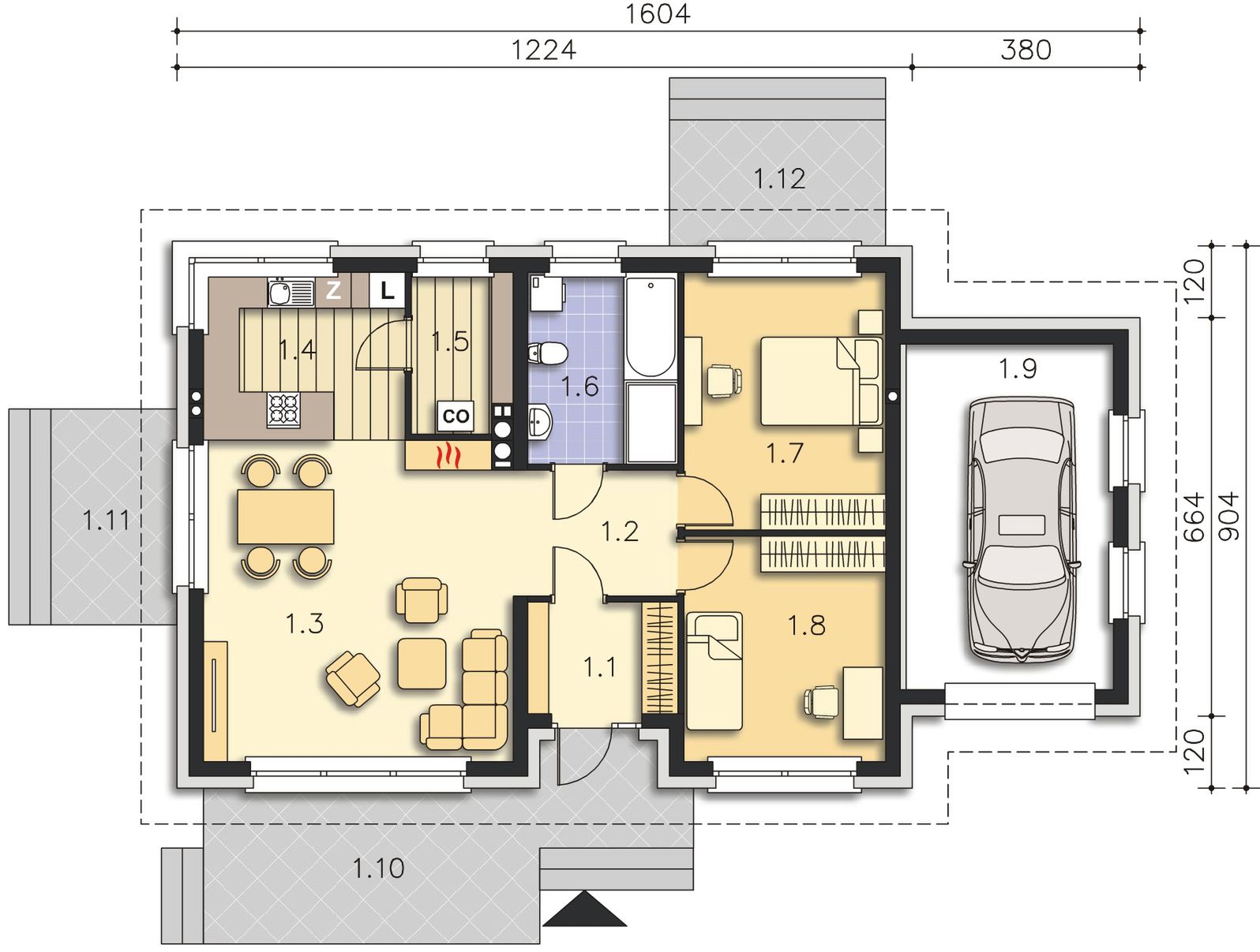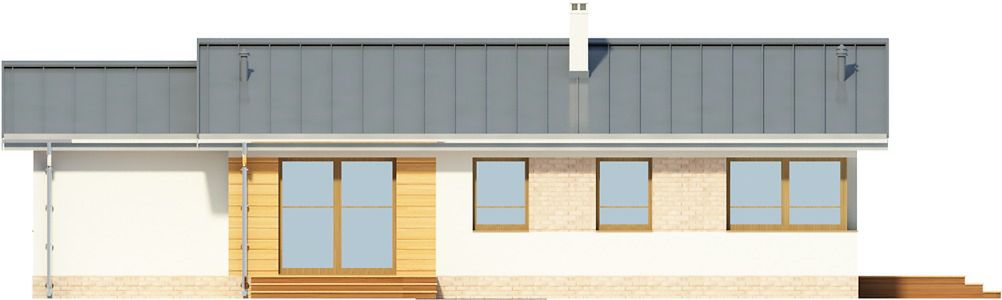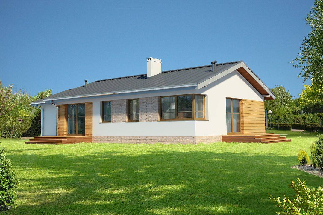 Graficzne opracowanie rzutów poglądowych widocznych na karcie projektu zostało wykonane przez Extradom.pl. Prezentowane przez Extradom.pl wizualizacje wykonane zostały przez autora projektu i należy poczytywać je jedynie za przykład i propozycję wykończenia, wizję architektoniczną autora projektu. Ostateczne wykończenie budynku może nastąpić na wiele sposobów. Szczegółowe rozwiązania zastosowane w oferowanej dokumentacji - w tym również ilość, lokalizacje i wygląd okien, drzwi, kominów - mogą w niewielkim stopniu różnić się od prezentowanej wizualizacji budynku.