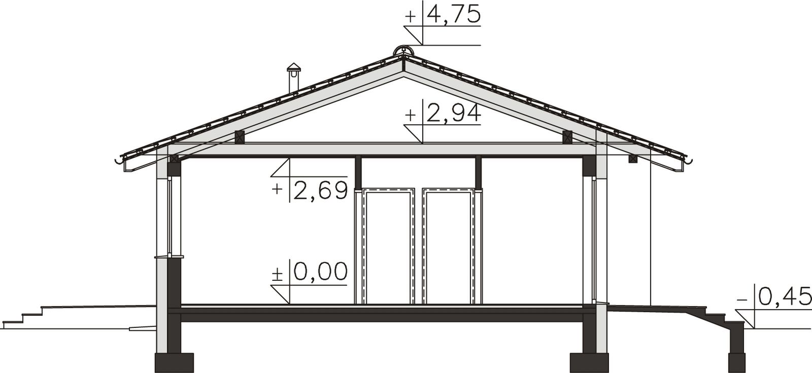 Fundamenty - rozwiązanie o podwyższonej izolacji termicznej. Ściany zewnętrzne - Bloczek silikatowy 24 cm + styropian 20 cm. Dach - wiązary prefabrykowane. Ogrzewanie - c.o. grzejnikowe + c.w.u. - kocioł gazowy Ogrzewanie - c.o. grzejnikowe + c.w.u. - kocioł gazowy. Wentylacja - grawitacyjna.