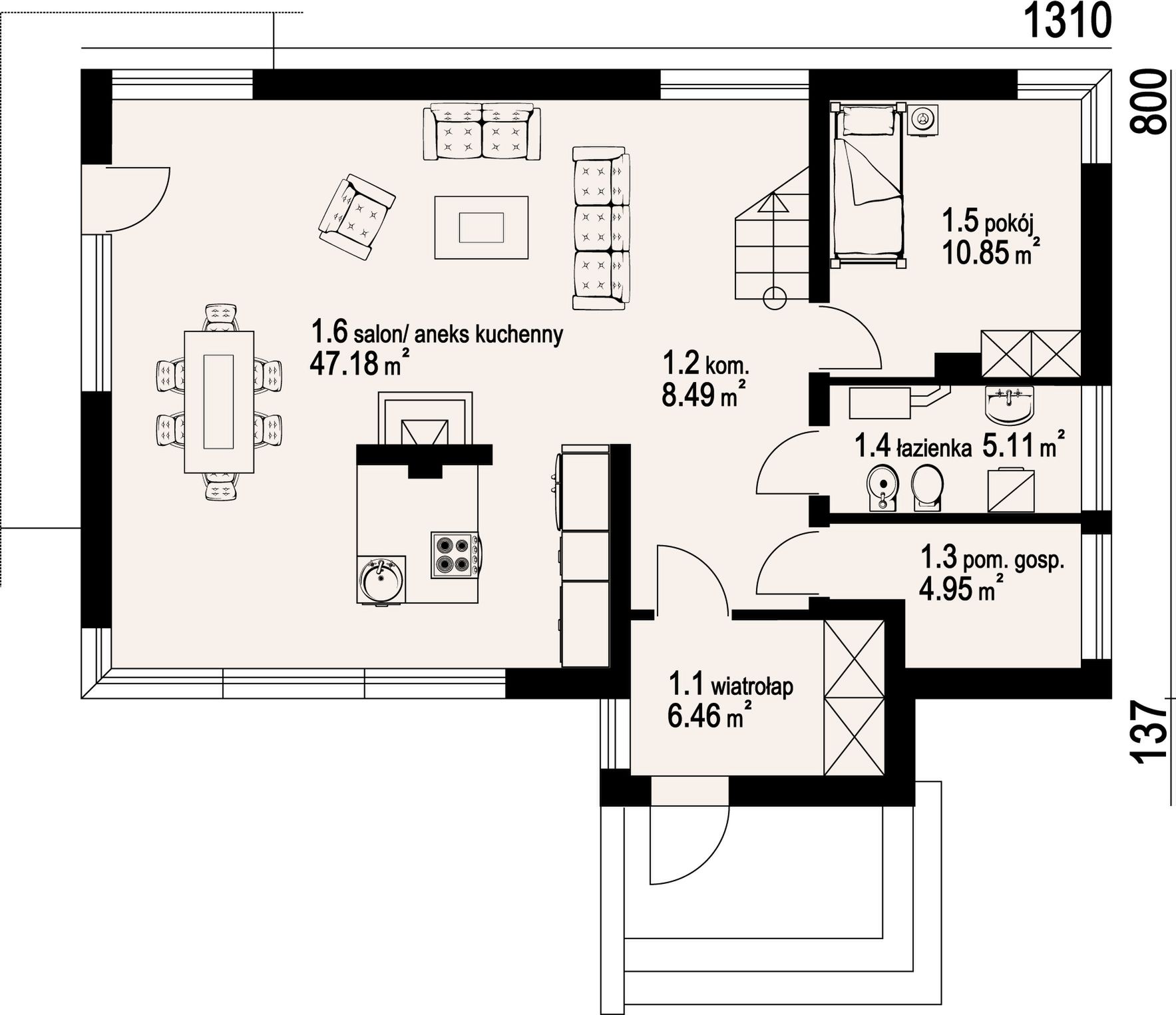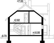 Wys. ścianki kolankowej 1.18 m Ilość drewna na więźbę 8.2 m³. Strop: płyta żelbetowa. Pokrycie dachu: dachówka ceramiczna. Ściany wewnętrzne: pustaki ceramiczne. Ściany zewnętrzne: pustaki ceramiczne + styropian. Typ ogrzewania: kocioł gazowy lub kocioł na paliwo stałe.