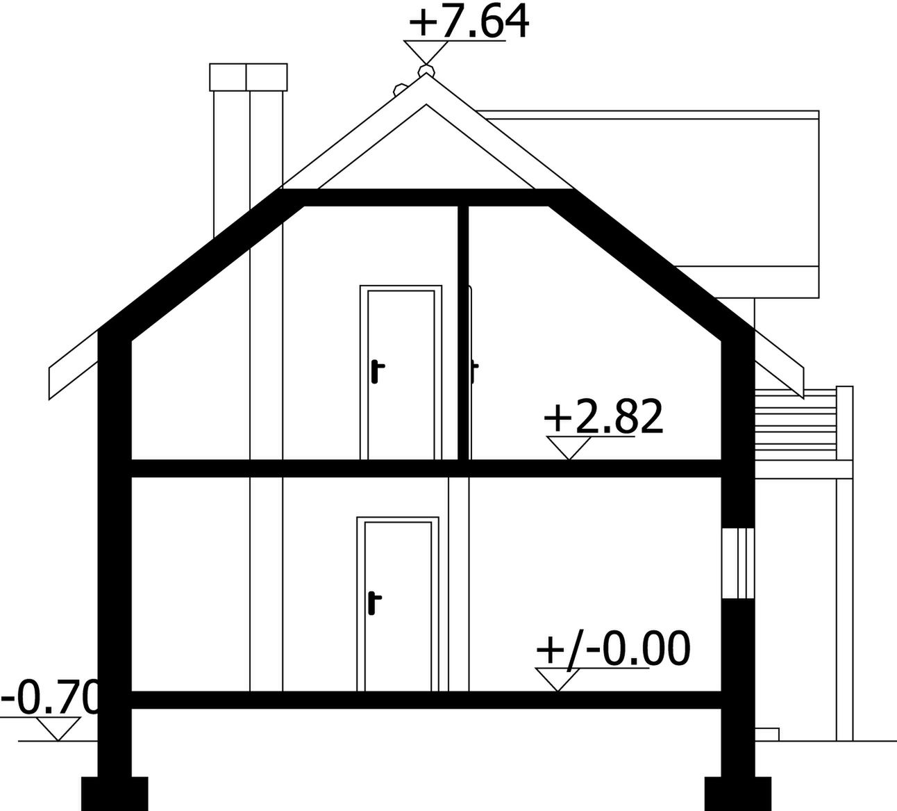 Wysokość ścianki kolankowej: 1.4 m. Ilość drewna na więźbę: 8.05 m³. Strop: płyta żelbetowa. Pokrycie dachu: dachówka ceramiczna. Ściany zewnętrzne: pustaki ceramiczne + styropian. Ściany wewnętrzne: pustaki ceramiczne. Typ ogrzewania: kocioł gazowy lub kocioł na paliwo stałe. Inne: okna połaciowe Fakro.