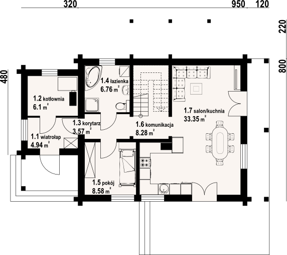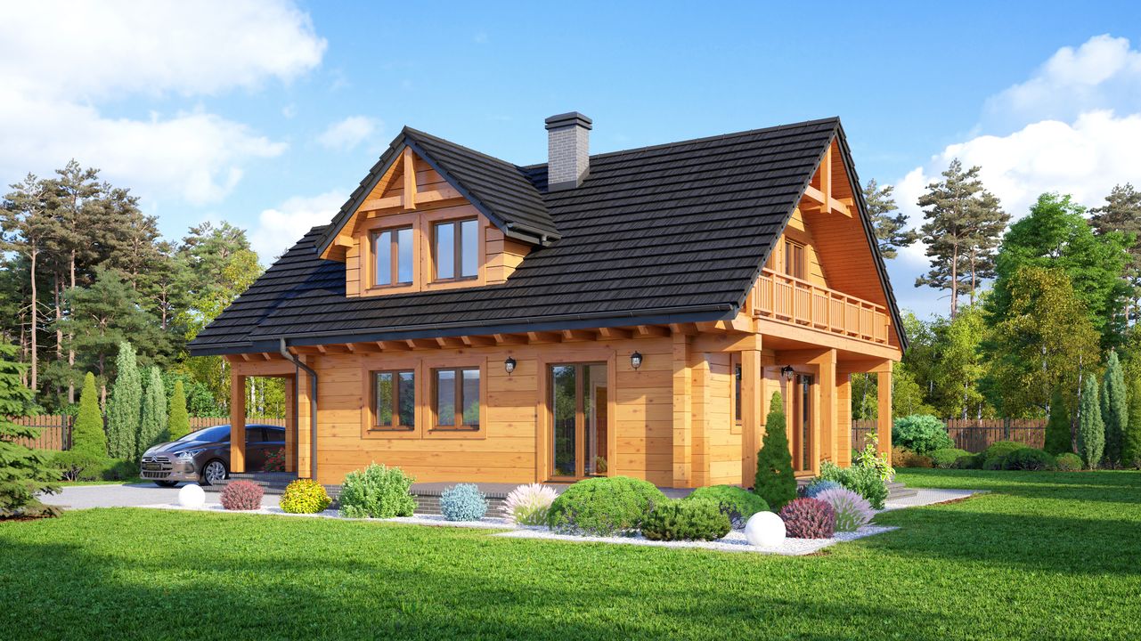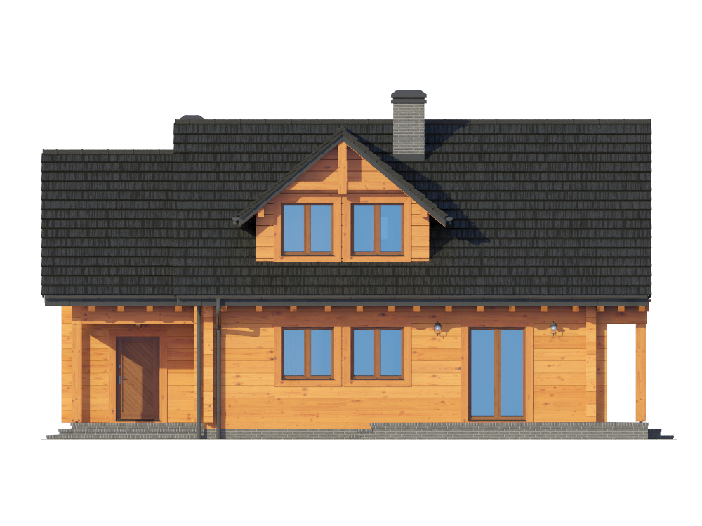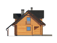 Wysokość ścianki kolankowej: 0.7 m. Strop: drewniany. Pokrycie dachu: dachówka gontopodobna Gerard Corona. Ściany zewnętrzne: płazy drewniane + wełna mineralna + deska. Ściany wewnętrzne: płazy drewniane. Typ ogrzewania: kocioł gazowy lub kocioł na paliwo stałe.