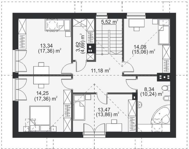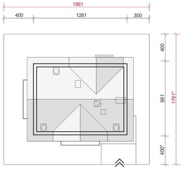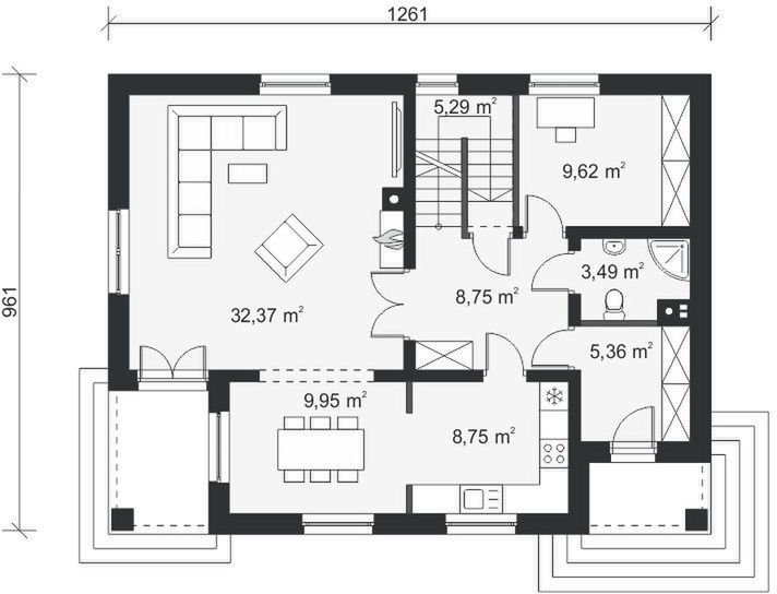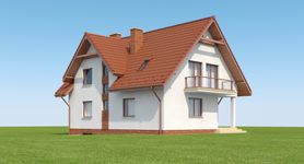 Graficzne opracowanie rzutów poglądowych widocznych na karcie projektu zostało wykonane przez Extradom.pl. Prezentowane przez Extradom.pl wizualizacje wykonane zostały przez autora projektu i należy poczytywać je jedynie za przykład i propozycję wykończenia, wizję architektoniczną autora projektu. Ostateczne wykończenie budynku może nastąpić na wiele sposobów. Szczegółowe rozwiązania zastosowane w oferowanej dokumentacji - w tym również ilość, lokalizacje i wygląd okien, drzwi, kominów - mogą w niewielkim stopniu różnić się od prezentowanej wizualizacji budynku.