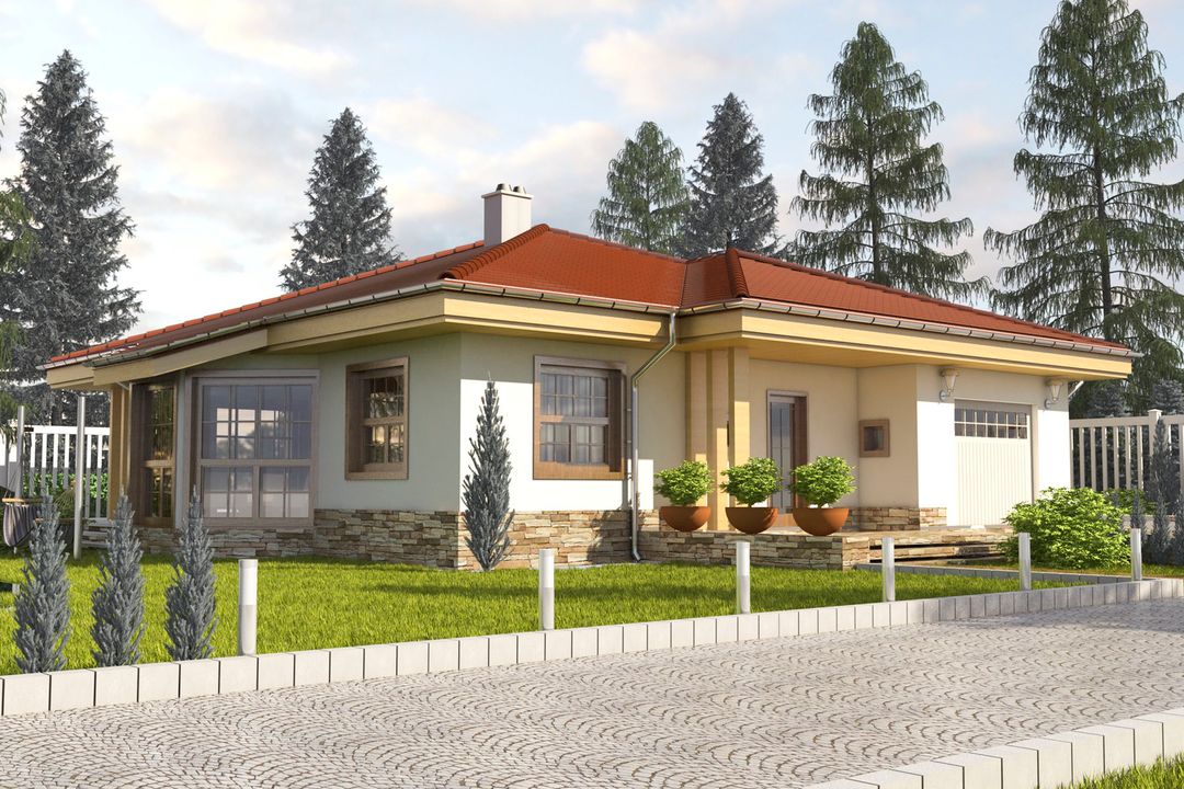 Graficzne opracowanie rzutów poglądowych widocznych na karcie projektu zostało wykonane przez Extradom.pl. Prezentowane przez Extradom.pl wizualizacje wykonane zostały przez autora projektu i należy poczytywać je jedynie za przykład i propozycję wykończenia, wizję architektoniczną autora projektu. Ostateczne wykończenie budynku może nastąpić na wiele sposobów. Szczegółowe rozwiązania zastosowane w oferowanej dokumentacji - w tym również ilość, lokalizacje i wygląd okien, drzwi, kominów - mogą w niewielkim stopniu różnić się od prezentowanej wizualizacji budynku.