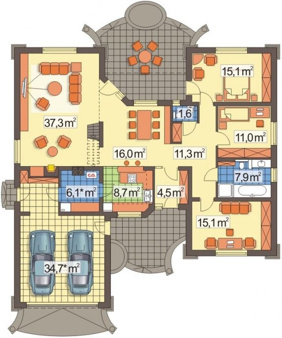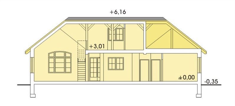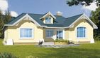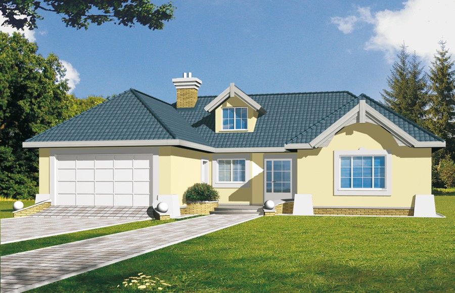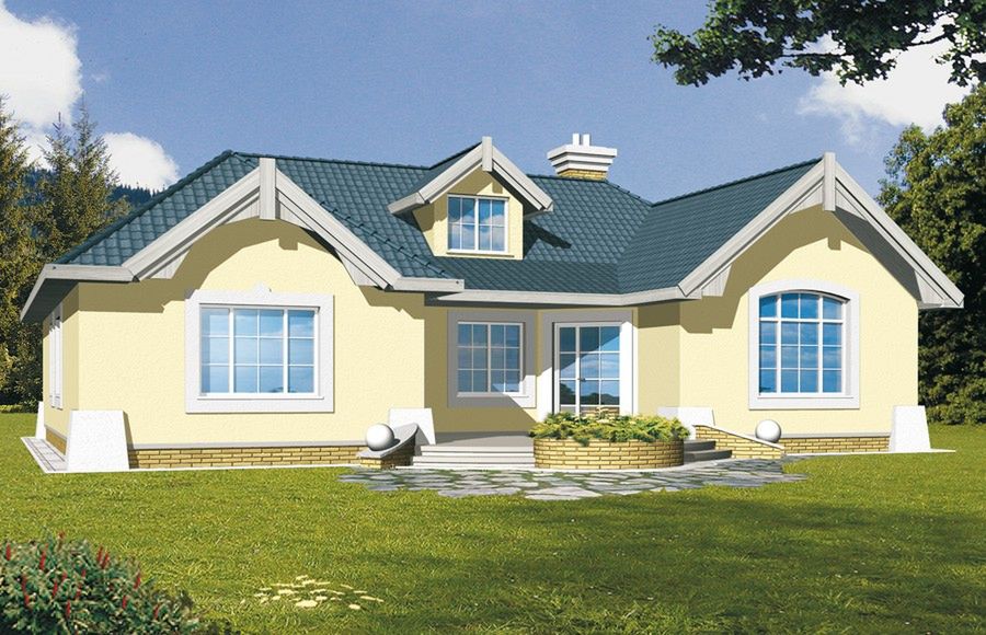 Graficzne opracowanie rzutów poglądowych widocznych na karcie projektu zostało wykonane przez Extradom.pl. Prezentowane przez Extradom.pl wizualizacje wykonane zostały przez autora projektu i należy poczytywać je jedynie za przykład i propozycję wykończenia, wizję architektoniczną autora projektu. Ostateczne wykończenie budynku może nastąpić na wiele sposobów. Szczegółowe rozwiązania zastosowane w oferowanej dokumentacji - w tym również ilość, lokalizacje i wygląd okien, drzwi, kominów - mogą w niewielkim stopniu różnić się od prezentowanej wizualizacji budynku.