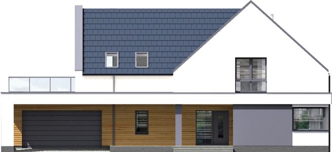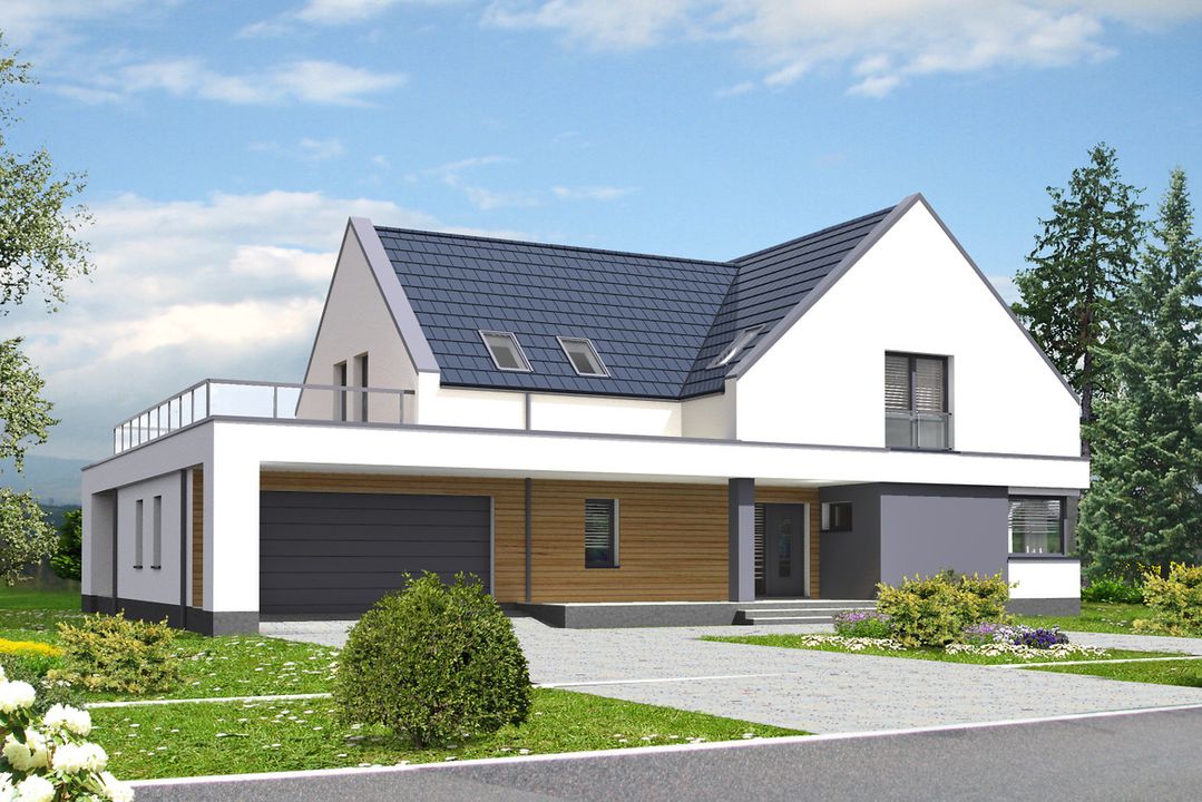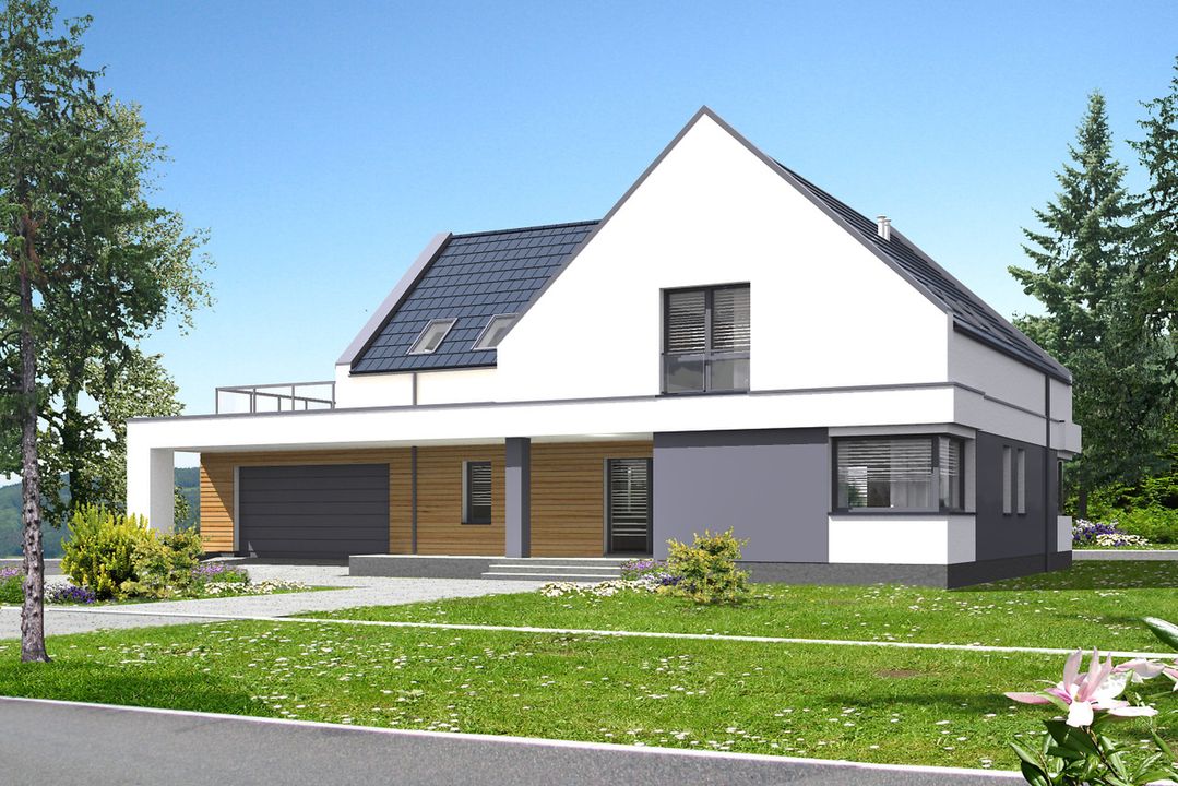 Graficzne opracowanie rzutów poglądowych widocznych na karcie projektu zostało wykonane przez Extradom.pl. Prezentowane przez Extradom.pl wizualizacje wykonane zostały przez autora projektu i należy poczytywać je jedynie za przykład i propozycję wykończenia, wizję architektoniczną autora projektu. Ostateczne wykończenie budynku może nastąpić na wiele sposobów. Szczegółowe rozwiązania zastosowane w oferowanej dokumentacji - w tym również ilość, lokalizacje i wygląd okien, drzwi, kominów - mogą w niewielkim stopniu różnić się od prezentowanej wizualizacji budynku.
