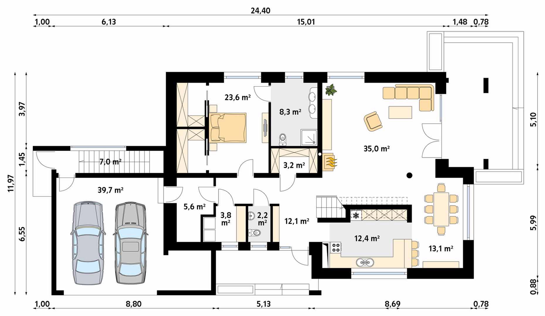 Graficzne opracowanie rzutów poglądowych widocznych na karcie projektu zostało wykonane przez Extradom.pl. Prezentowane przez Extradom.pl wizualizacje wykonane zostały przez autora projektu i należy poczytywać je jedynie za przykład i propozycję wykończenia, wizję architektoniczną autora projektu. Ostateczne wykończenie budynku może nastąpić na wiele sposobów. Szczegółowe rozwiązania zastosowane w oferowanej dokumentacji - w tym również ilość, lokalizacje i wygląd okien, drzwi, kominów - mogą w niewielkim stopniu różnić się od prezentowanej wizualizacji budynku.