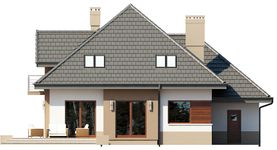 Graficzne opracowanie rzutów poglądowych widocznych na karcie projektu zostało wykonane przez Extradom.pl. Prezentowane przez Extradom.pl wizualizacje wykonane zostały przez autora projektu i należy poczytywać je jedynie za przykład i propozycję wykończenia, wizję architektoniczną autora projektu. Ostateczne wykończenie budynku może nastąpić na wiele sposobów. Szczegółowe rozwiązania zastosowane w oferowanej dokumentacji - w tym również ilość, lokalizacje i wygląd okien, drzwi, kominów - mogą w niewielkim stopniu różnić się od prezentowanej wizualizacji budynku.