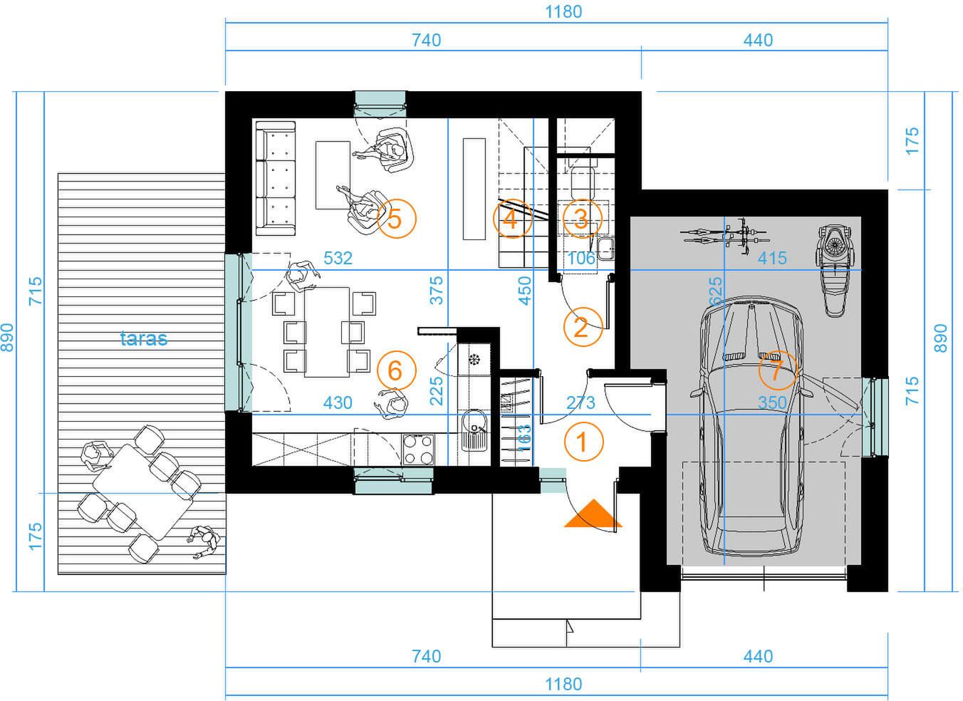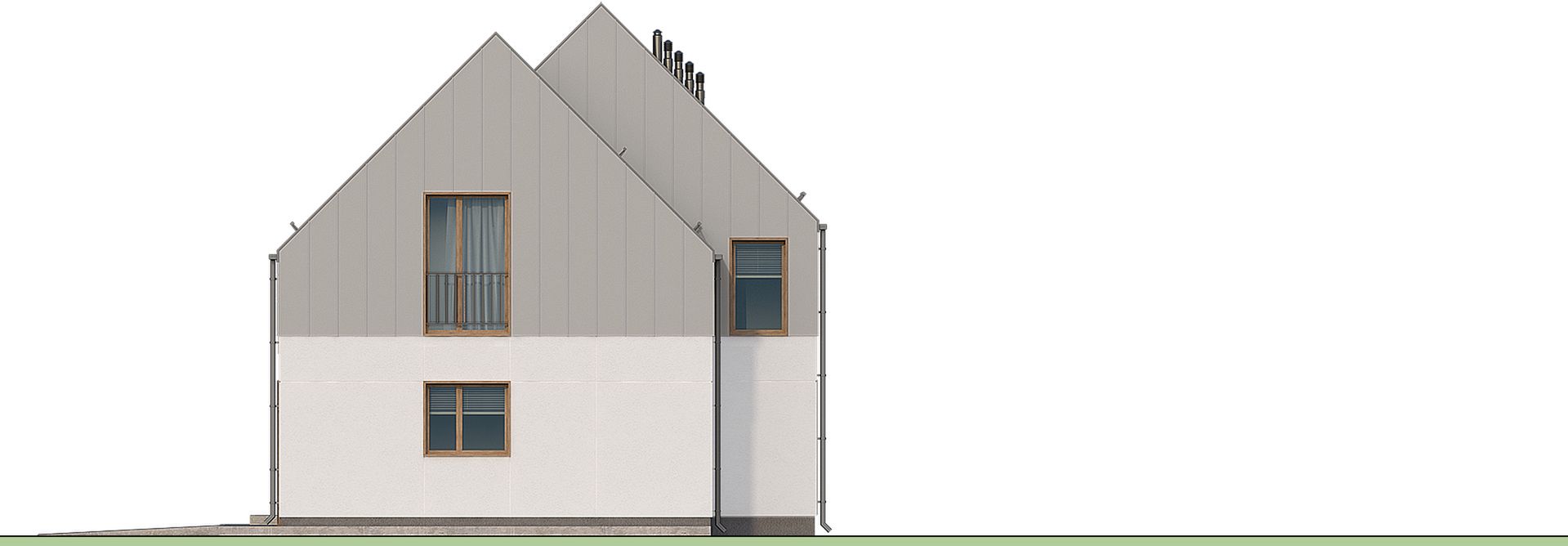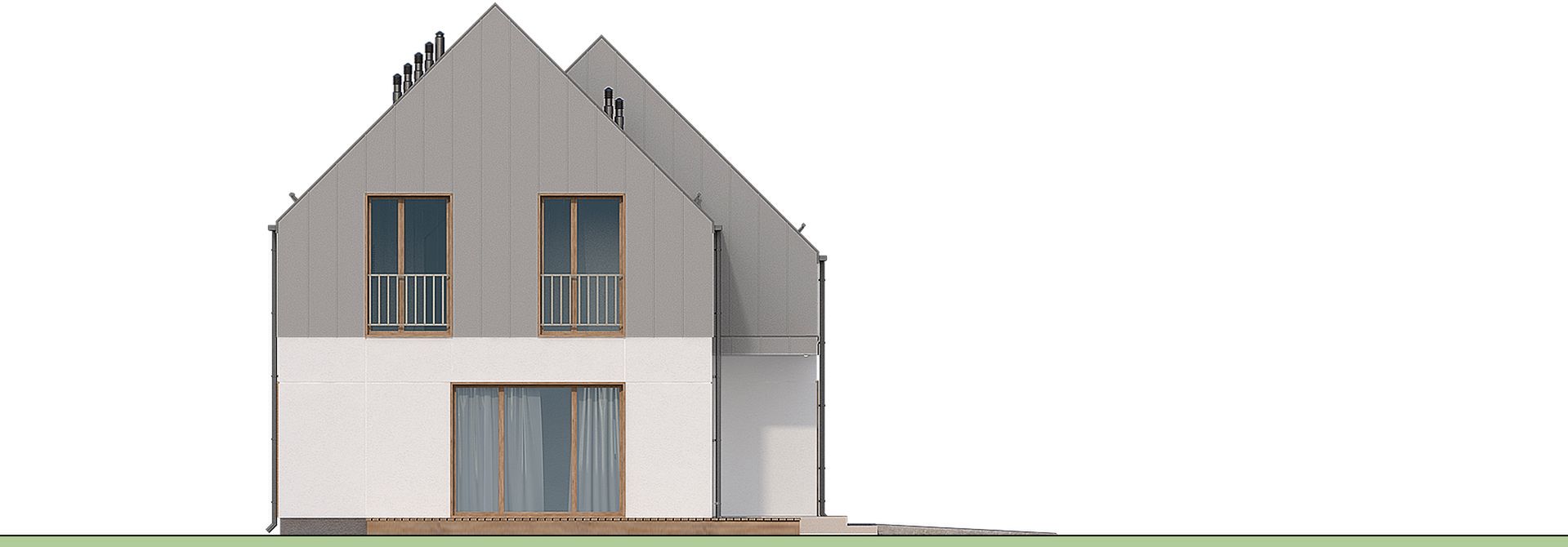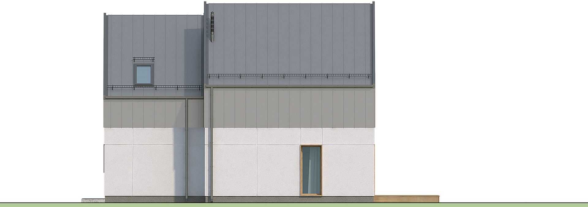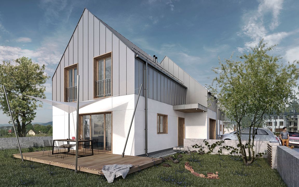 Graficzne opracowanie rzutów poglądowych widocznych na karcie projektu zostało wykonane przez Extradom.pl. Prezentowane przez Extradom.pl wizualizacje wykonane zostały przez autora projektu i należy poczytywać je jedynie za przykład i propozycję wykończenia, wizję architektoniczną autora projektu. Ostateczne wykończenie budynku może nastąpić na wiele sposobów. Szczegółowe rozwiązania zastosowane w oferowanej dokumentacji - w tym również ilość, lokalizacje i wygląd okien, drzwi, kominów - mogą w niewielkim stopniu różnić się od prezentowanej wizualizacji budynku.