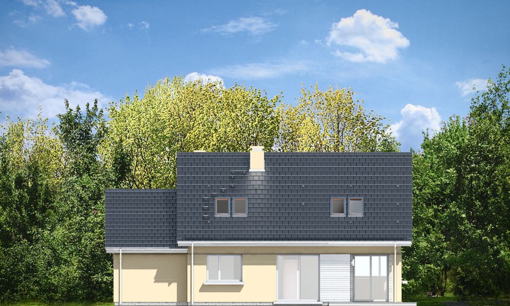Graficzne opracowanie rzutów poglądowych widocznych na karcie projektu zostało wykonane przez Extradom.pl. Prezentowane przez Extradom.pl wizualizacje wykonane zostały przez autora projektu i należy poczytywać je jedynie za przykład i propozycję wykończenia, wizję architektoniczną autora projektu. Ostateczne wykończenie budynku może nastąpić na wiele sposobów. Szczegółowe rozwiązania zastosowane w oferowanej dokumentacji - w tym również ilość, lokalizacje i wygląd okien, drzwi, kominów - mogą w niewielkim stopniu różnić się od prezentowanej wizualizacji budynku.