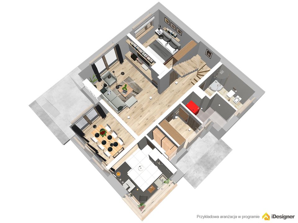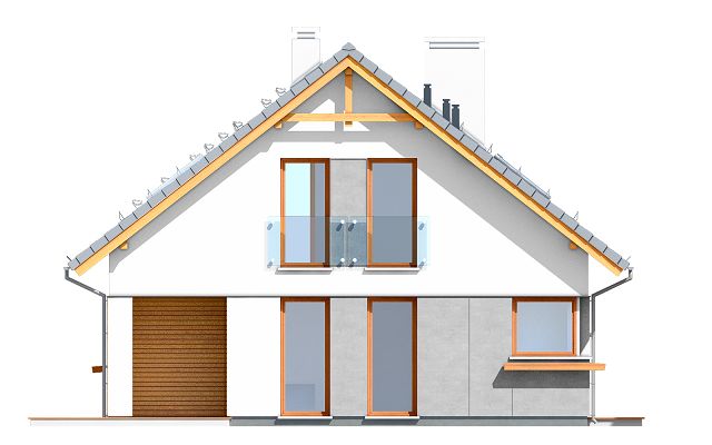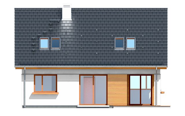 Graficzne opracowanie rzutów poglądowych widocznych na karcie projektu zostało wykonane przez Extradom.pl. Prezentowane przez Extradom.pl wizualizacje wykonane zostały przez autora projektu i należy poczytywać je jedynie za przykład i propozycję wykończenia, wizję architektoniczną autora projektu. Ostateczne wykończenie budynku może nastąpić na wiele sposobów. Szczegółowe rozwiązania zastosowane w oferowanej dokumentacji - w tym również ilość, lokalizacje i wygląd okien, drzwi, kominów - mogą w niewielkim stopniu różnić się od prezentowanej wizualizacji budynku.