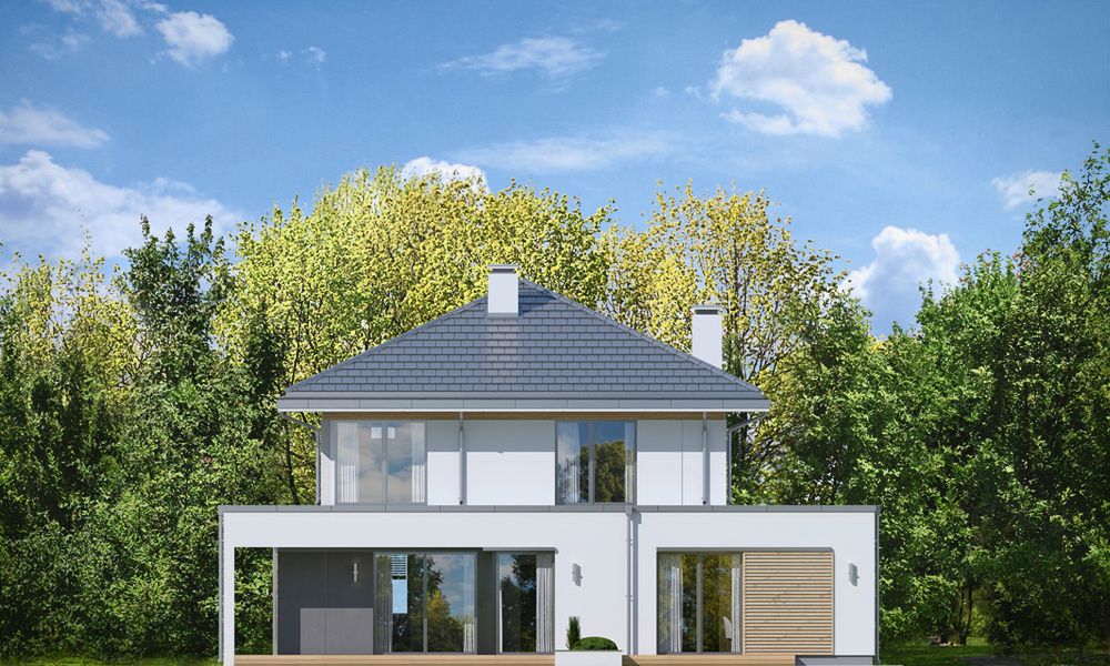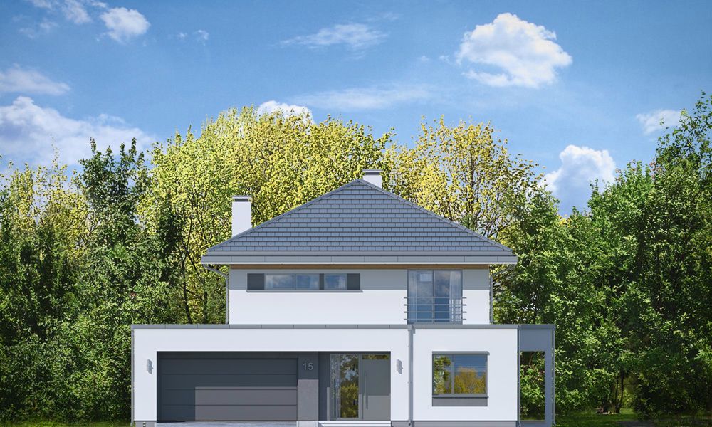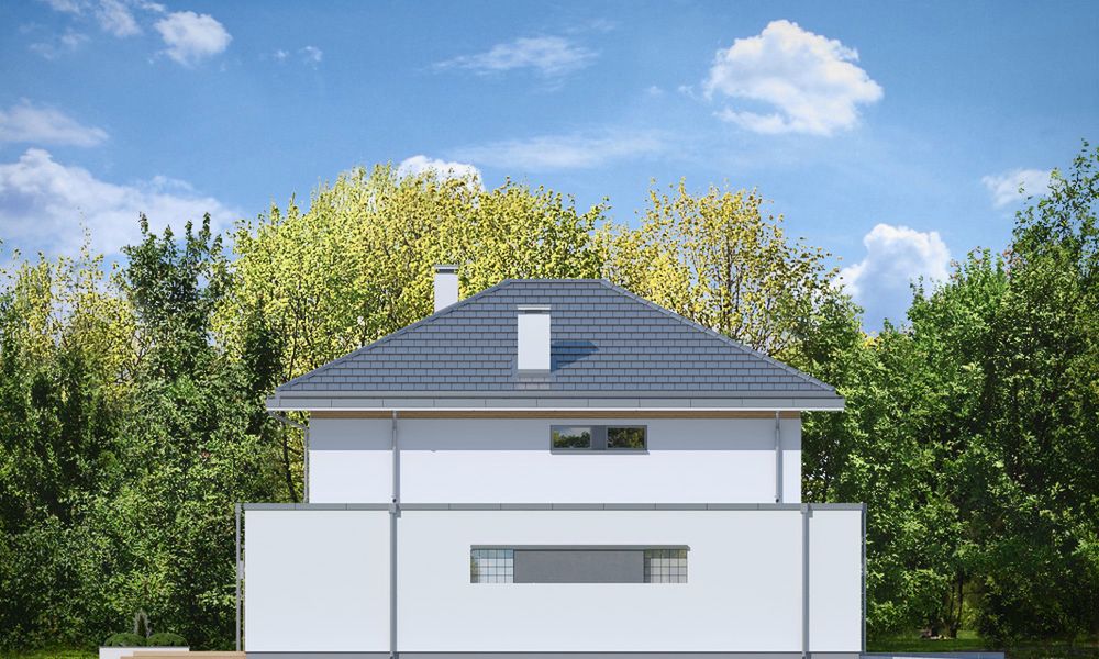 Graficzne opracowanie rzutów poglądowych widocznych na karcie projektu zostało wykonane przez Extradom.pl. Prezentowane przez Extradom.pl wizualizacje wykonane zostały przez autora projektu i należy poczytywać je jedynie za przykład i propozycję wykończenia, wizję architektoniczną autora projektu. Ostateczne wykończenie budynku może nastąpić na wiele sposobów. Szczegółowe rozwiązania zastosowane w oferowanej dokumentacji - w tym również ilość, lokalizacje i wygląd okien, drzwi, kominów - mogą w niewielkim stopniu różnić się od prezentowanej wizualizacji budynku.