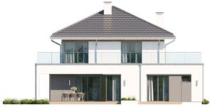 Graficzne opracowanie rzutów poglądowych widocznych na karcie projektu zostało wykonane przez Extradom.pl. Prezentowane przez Extradom.pl wizualizacje wykonane zostały przez autora projektu i należy poczytywać je jedynie za przykład i propozycję wykończenia, wizję architektoniczną autora projektu. Ostateczne wykończenie budynku może nastąpić na wiele sposobów. Szczegółowe rozwiązania zastosowane w oferowanej dokumentacji - w tym również ilość, lokalizacje i wygląd okien, drzwi, kominów - mogą w niewielkim stopniu różnić się od prezentowanej wizualizacji budynku.