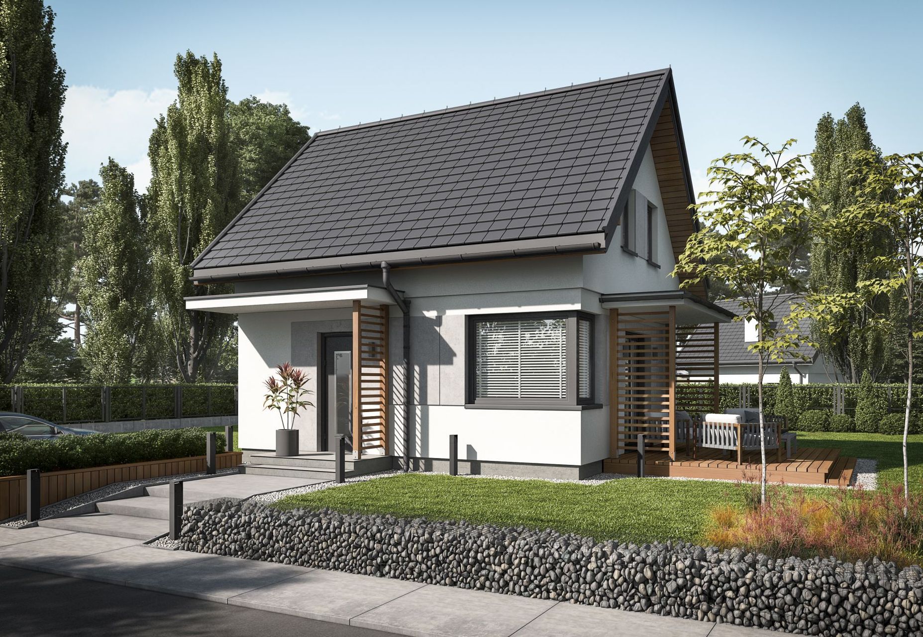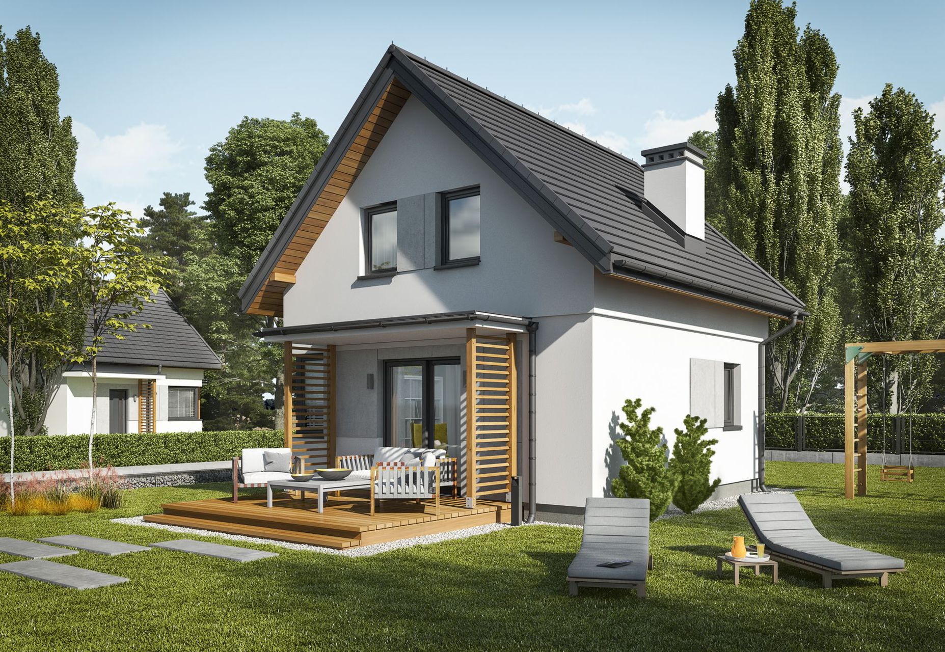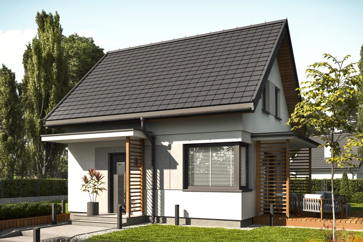 Kompaktowy dom z poddaszem użytkowym w tradycyjnym stylu, idealny dla trzy- lub czteroosobowej rodziny szukającej przytulnego i ekonomicznego miejsca do życia. Prosta bryła z dwuspadowym dachem łączy klasyczną estetykę z maksymalną funkcjonalnością na niewielkiej powierzchni, tworząc przemyślaną i komfortową przestrzeń.