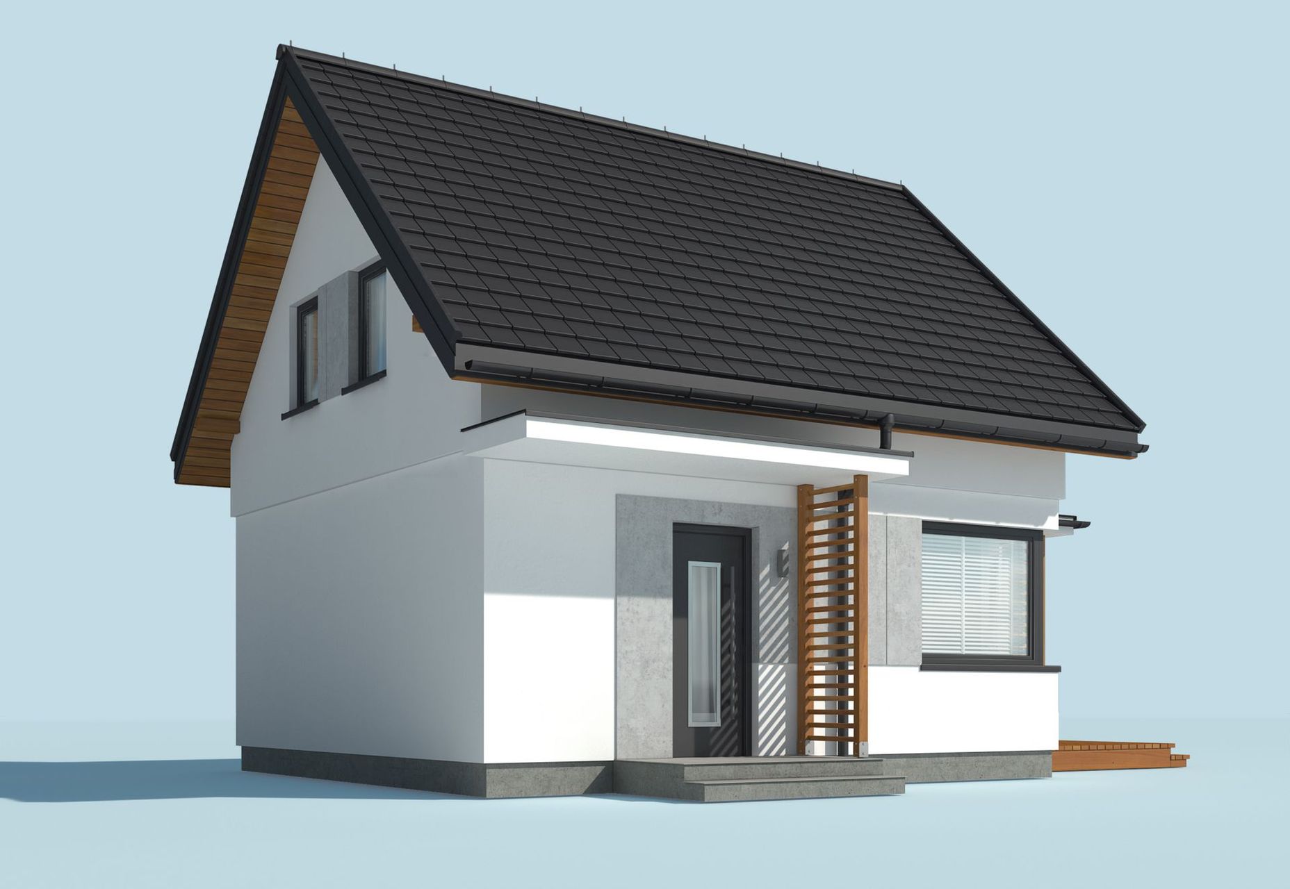 Graficzne opracowanie rzutów poglądowych widocznych na karcie projektu zostało wykonane przez Extradom.pl. Prezentowane przez Extradom.pl wizualizacje wykonane zostały przez autora projektu i należy poczytywać je jedynie za przykład i propozycję wykończenia, wizję architektoniczną autora projektu. Ostateczne wykończenie budynku może nastąpić na wiele sposobów. Szczegółowe rozwiązania zastosowane w oferowanej dokumentacji - w tym również ilość, lokalizacje i wygląd okien, drzwi, kominów - mogą w niewielkim stopniu różnić się od prezentowanej wizualizacji budynku.