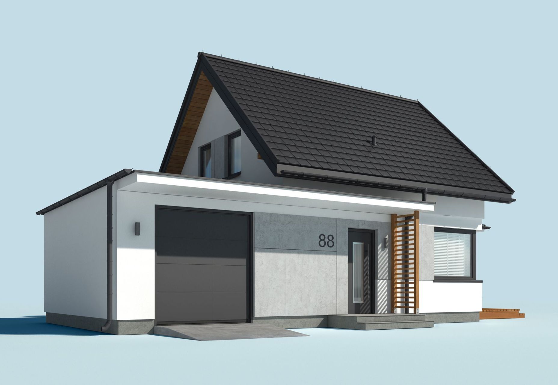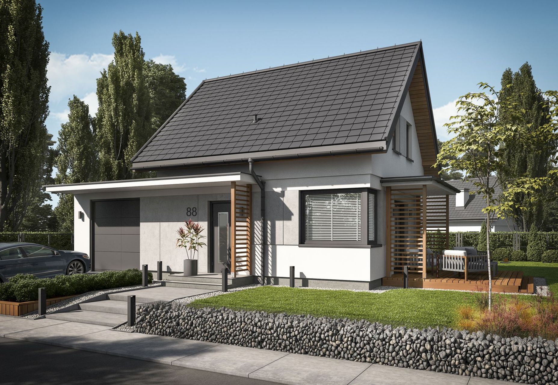 To projekt domu parterowego z poddaszem użytkowym oraz garażem w bryle budynku, stworzony z myślą o trzy- lub czteroosobowej rodzinie. Jego prosta konstrukcja i tradycyjny styl sprawiają, że jest to ekonomiczne i uniwersalne rozwiązanie, łączące kompaktowe wymiary z przemyślaną funkcjonalnością na każdy dzień.
