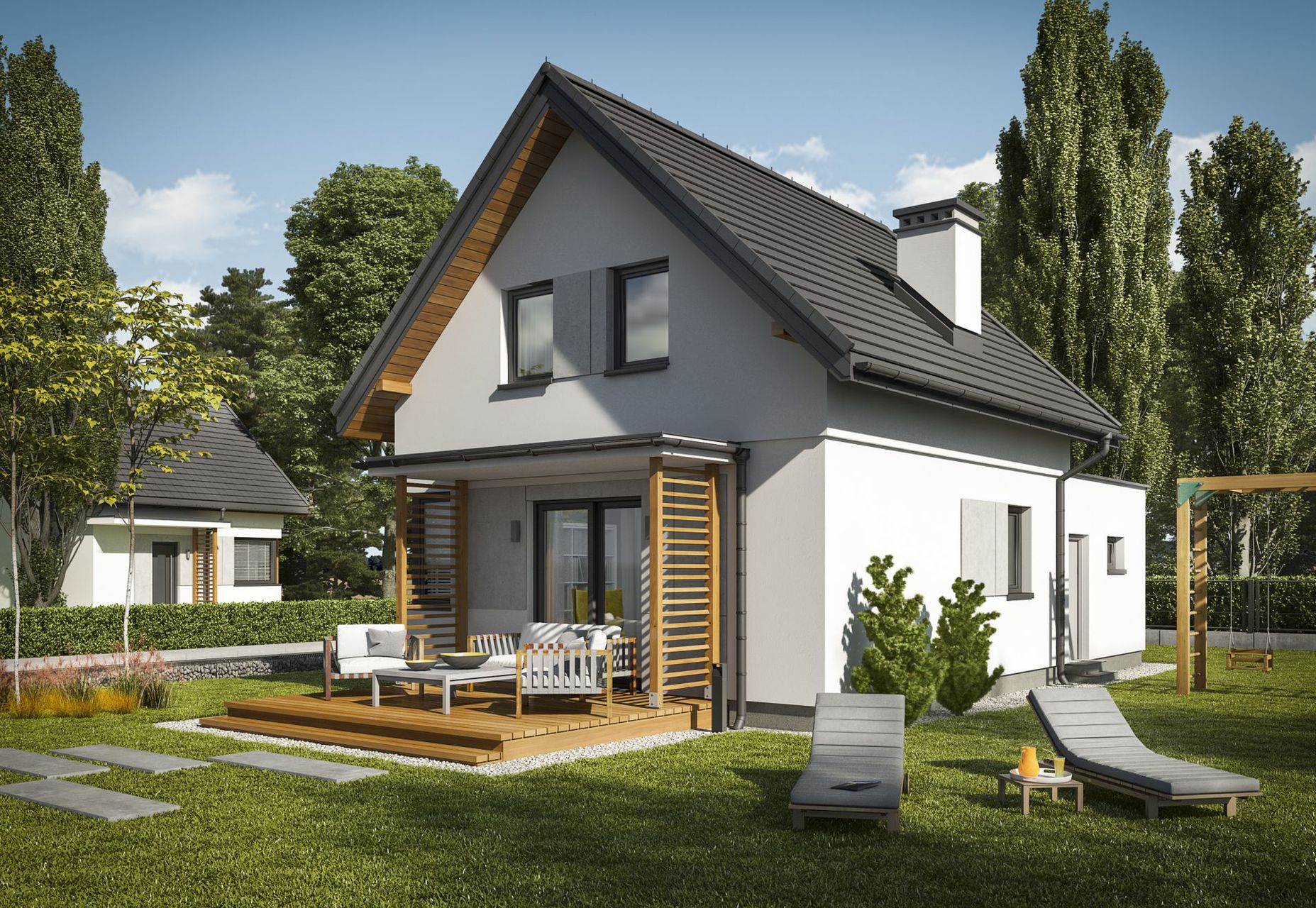 Dom Orlean 7A C charakteryzuje się prostą, zwartą bryłą przykrytą klasycznym dachem dwuspadowym, co jest sprawdzonym i ekonomicznym rozwiązaniem konstrukcyjnym. Tradycyjny styl budynku podkreśla jego ponadczasowy charakter, dzięki czemu doskonale wpisze się w każde otoczenie. Jednostanowiskowy garaż został zintegrowany z główną częścią domu, tworząc spójną całość. Projekt przewiduje również wyjście na taras od strony ogrodowej, który stanie się naturalnym przedłużeniem strefy dziennej w cieplejsze dni.