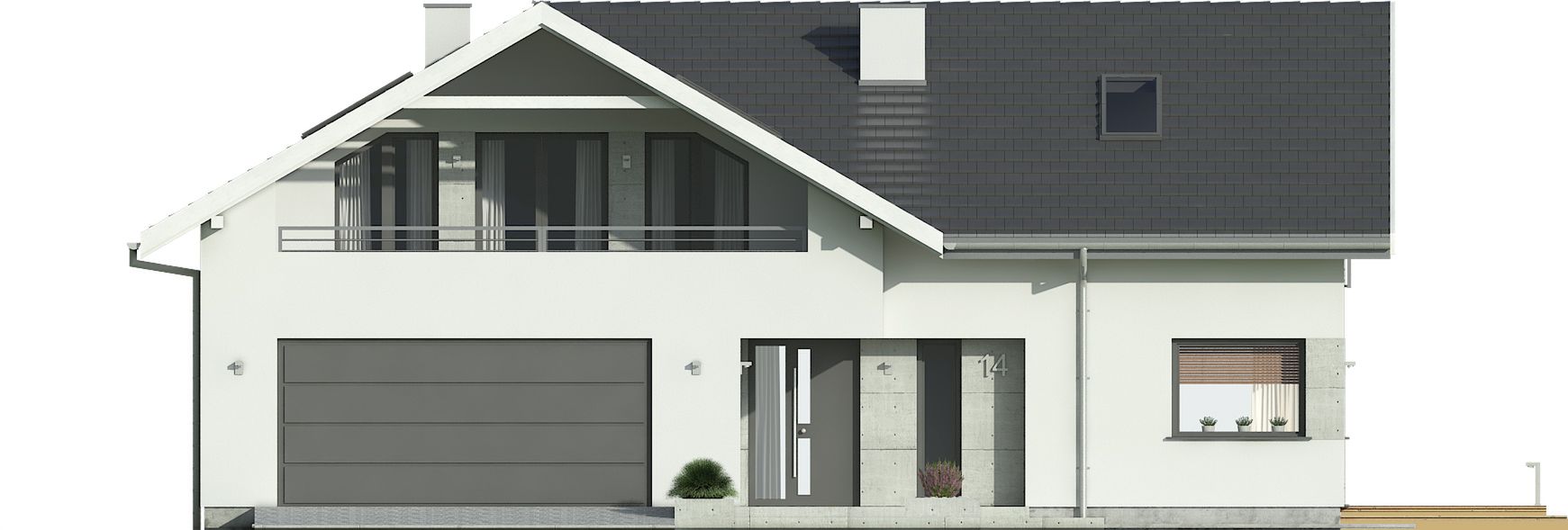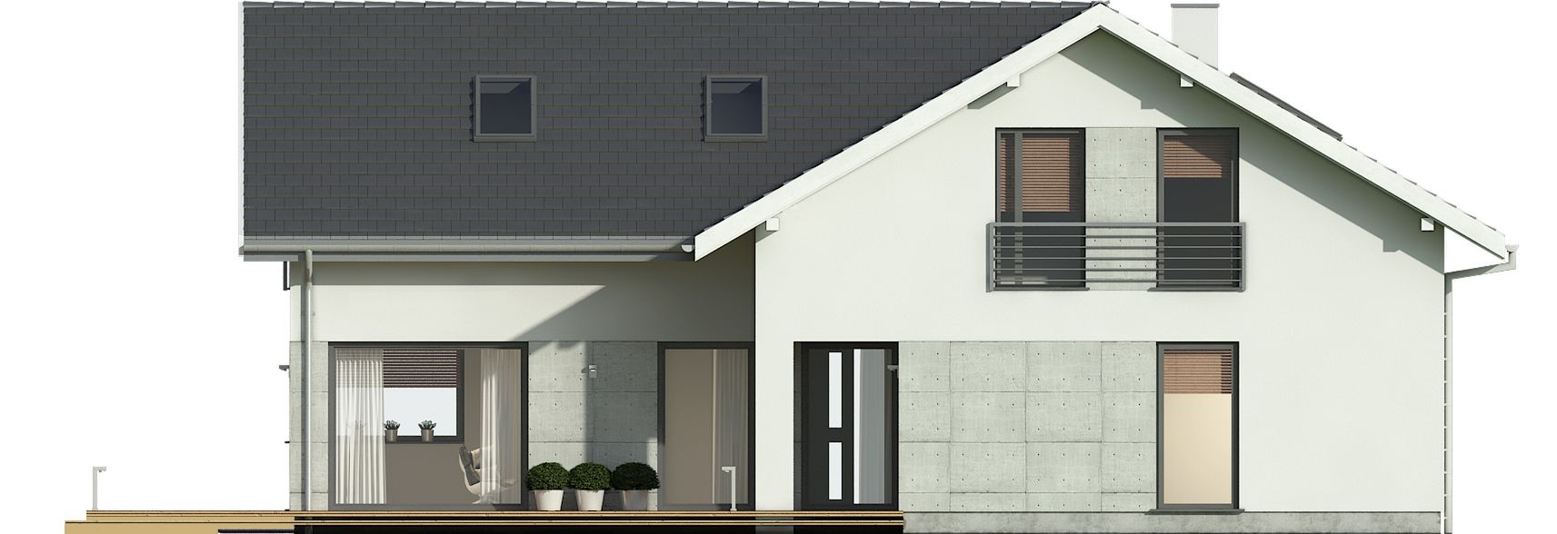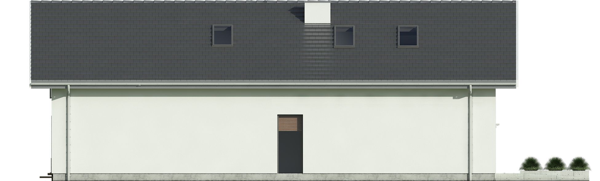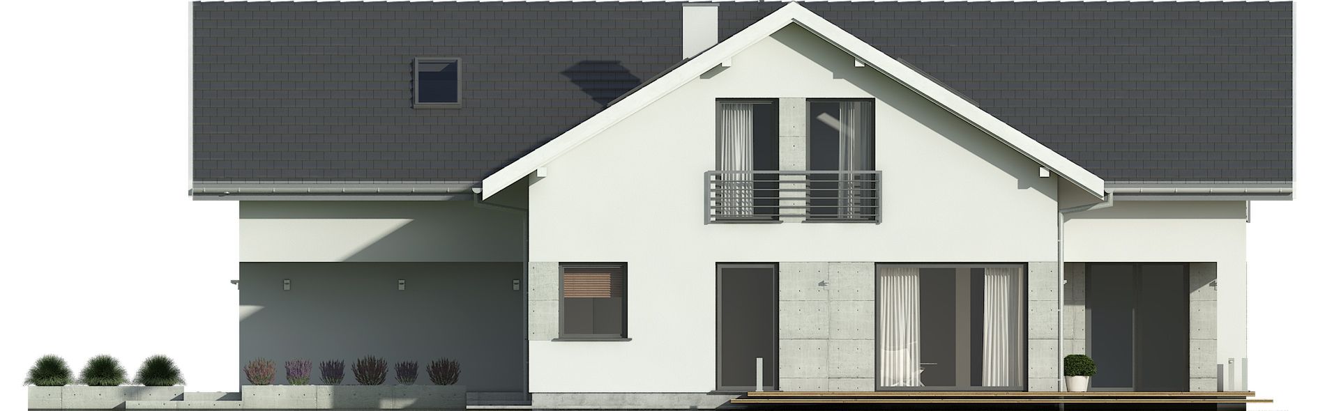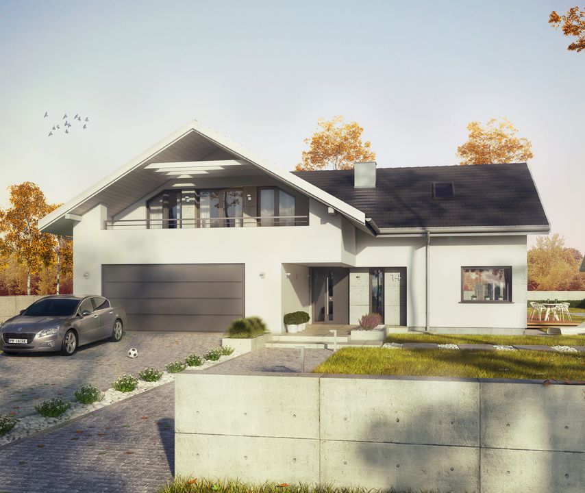 Graficzne opracowanie rzutów poglądowych widocznych na karcie projektu zostało wykonane przez Extradom.pl. Prezentowane przez Extradom.pl wizualizacje wykonane zostały przez autora projektu i należy poczytywać je jedynie za przykład i propozycję wykończenia, wizję architektoniczną autora projektu. Ostateczne wykończenie budynku może nastąpić na wiele sposobów. Szczegółowe rozwiązania zastosowane w oferowanej dokumentacji - w tym również ilość, lokalizacje i wygląd okien, drzwi, kominów - mogą w niewielkim stopniu różnić się od prezentowanej wizualizacji budynku.