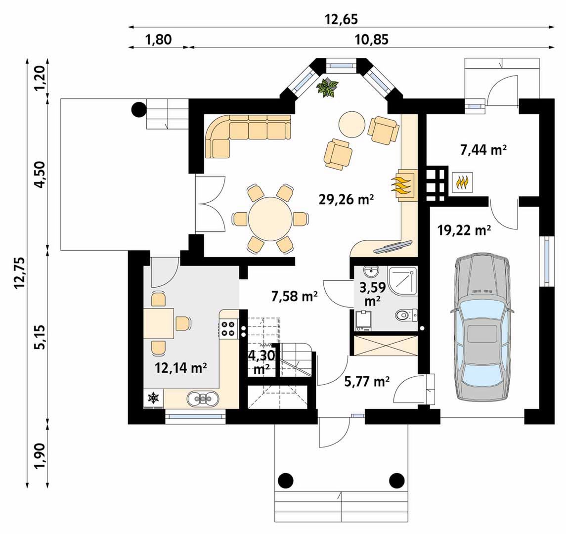 Graficzne opracowanie rzutów poglądowych widocznych na karcie projektu zostało wykonane przez Extradom.pl. Prezentowane przez Extradom.pl wizualizacje wykonane zostały przez autora projektu i należy poczytywać je jedynie za przykład i propozycję wykończenia, wizję architektoniczną autora projektu. Ostateczne wykończenie budynku może nastąpić na wiele sposobów. Szczegółowe rozwiązania zastosowane w oferowanej dokumentacji - w tym również ilość, lokalizacje i wygląd okien, drzwi, kominów - mogą w niewielkim stopniu różnić się od prezentowanej wizualizacji budynku.
