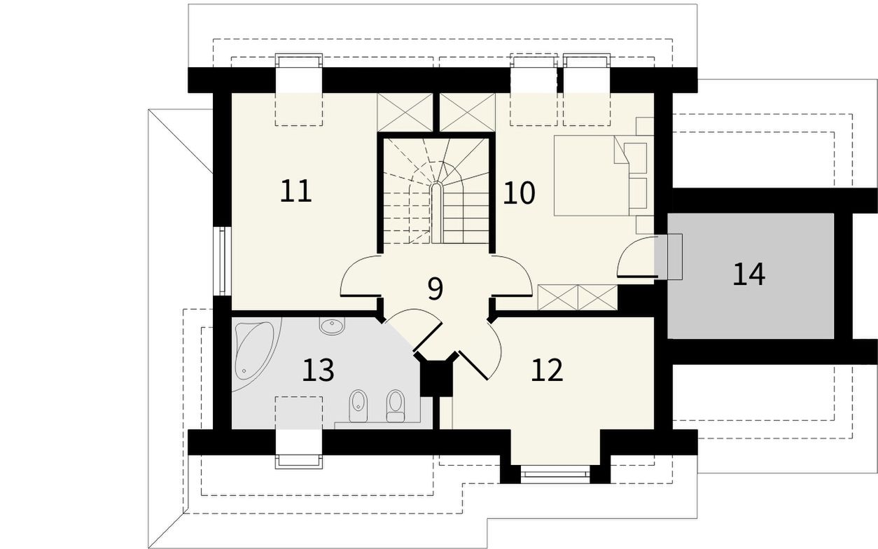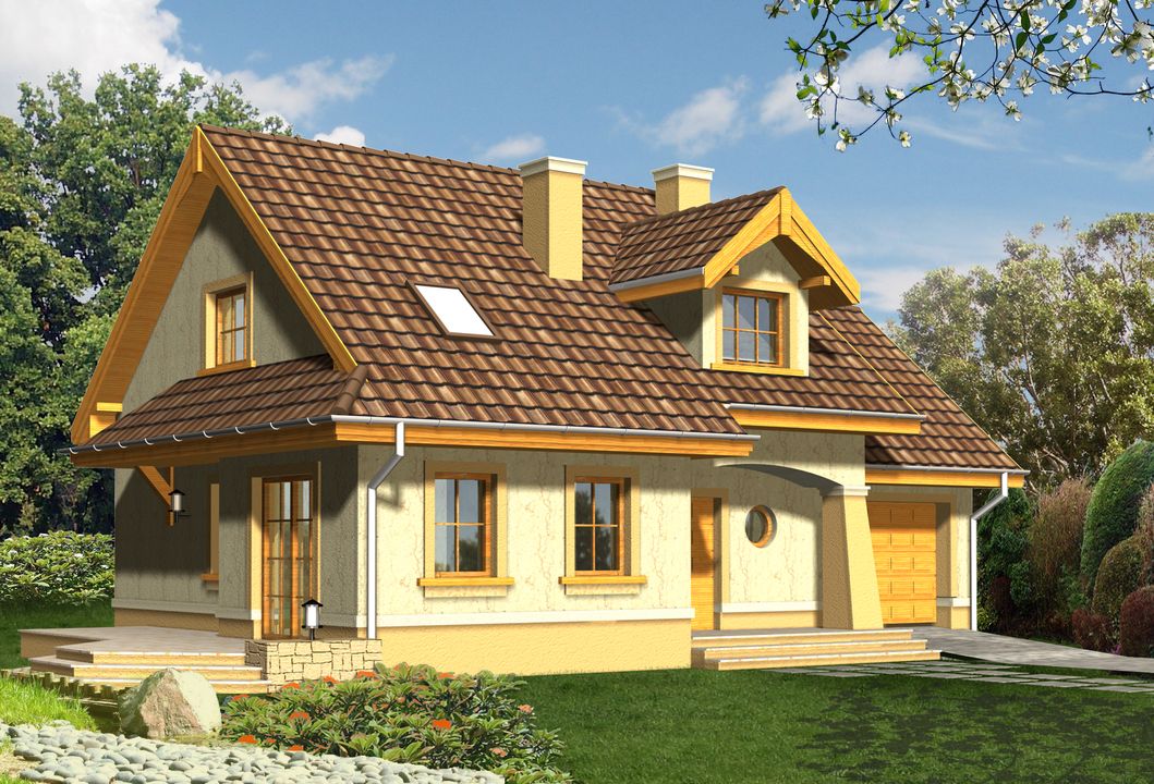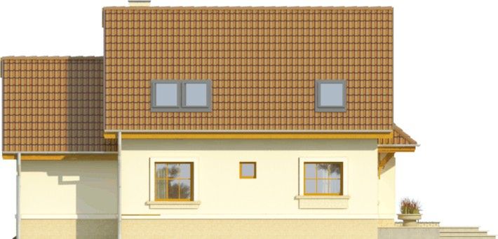 Graficzne opracowanie rzutów poglądowych widocznych na karcie projektu zostało wykonane przez Extradom.pl. Prezentowane przez Extradom.pl wizualizacje wykonane zostały przez autora projektu i należy poczytywać je jedynie za przykład i propozycję wykończenia, wizję architektoniczną autora projektu. Ostateczne wykończenie budynku może nastąpić na wiele sposobów. Szczegółowe rozwiązania zastosowane w oferowanej dokumentacji - w tym również ilość, lokalizacje i wygląd okien, drzwi, kominów - mogą w niewielkim stopniu różnić się od prezentowanej wizualizacji budynku.