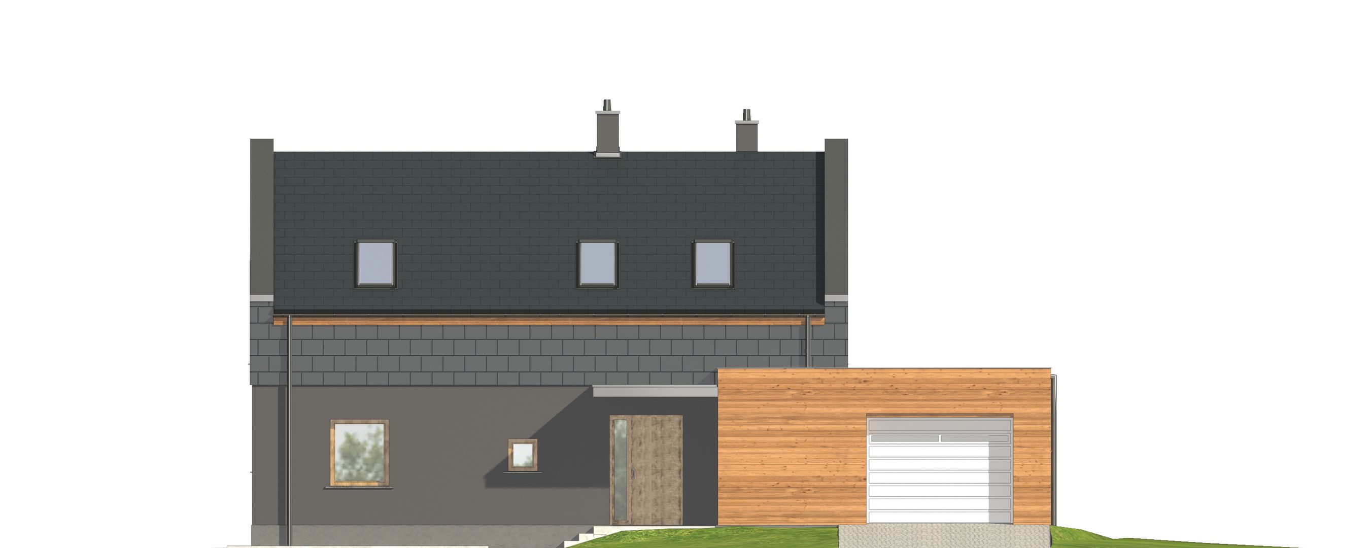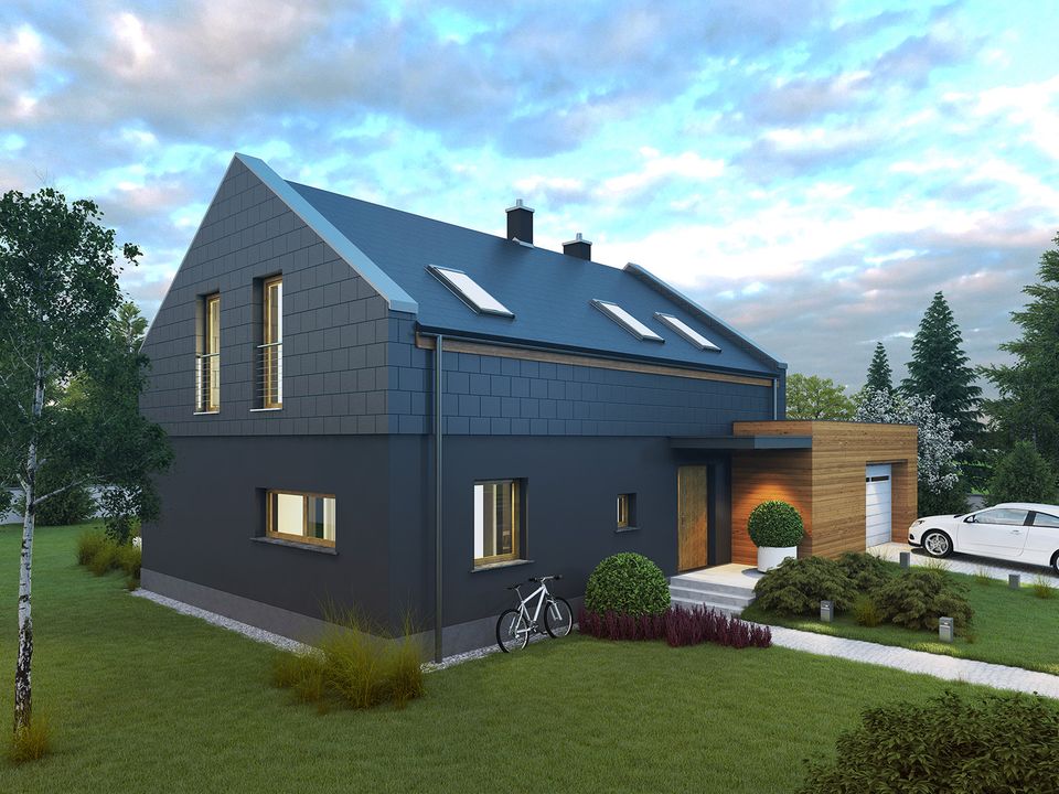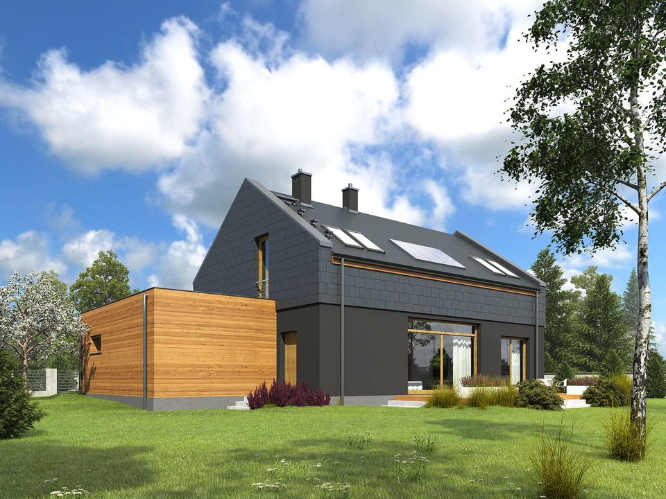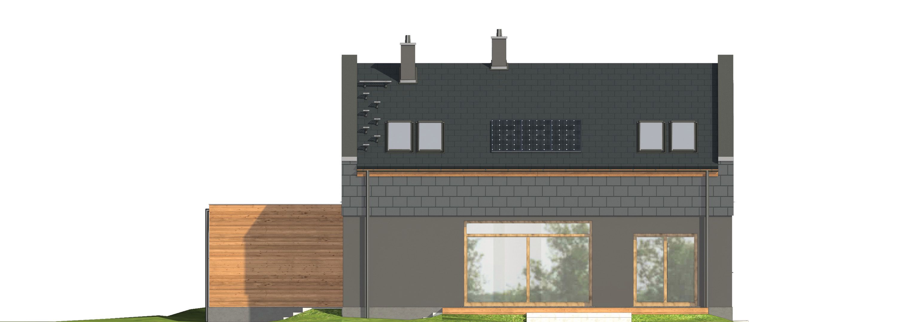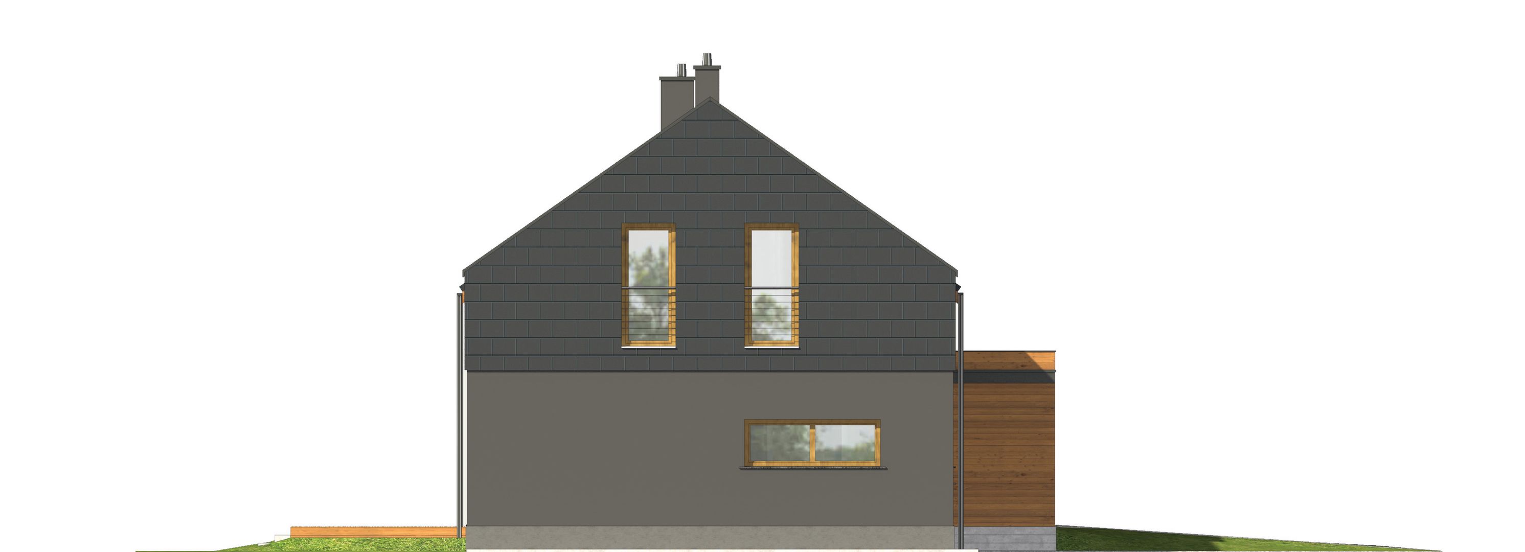 Graficzne opracowanie rzutów poglądowych widocznych na karcie projektu zostało wykonane przez Extradom.pl. Prezentowane przez Extradom.pl wizualizacje wykonane zostały przez autora projektu i należy poczytywać je jedynie za przykład i propozycję wykończenia, wizję architektoniczną autora projektu. Ostateczne wykończenie budynku może nastąpić na wiele sposobów. Szczegółowe rozwiązania zastosowane w oferowanej dokumentacji - w tym również ilość, lokalizacje i wygląd okien, drzwi, kominów - mogą w niewielkim stopniu różnić się od prezentowanej wizualizacji budynku.