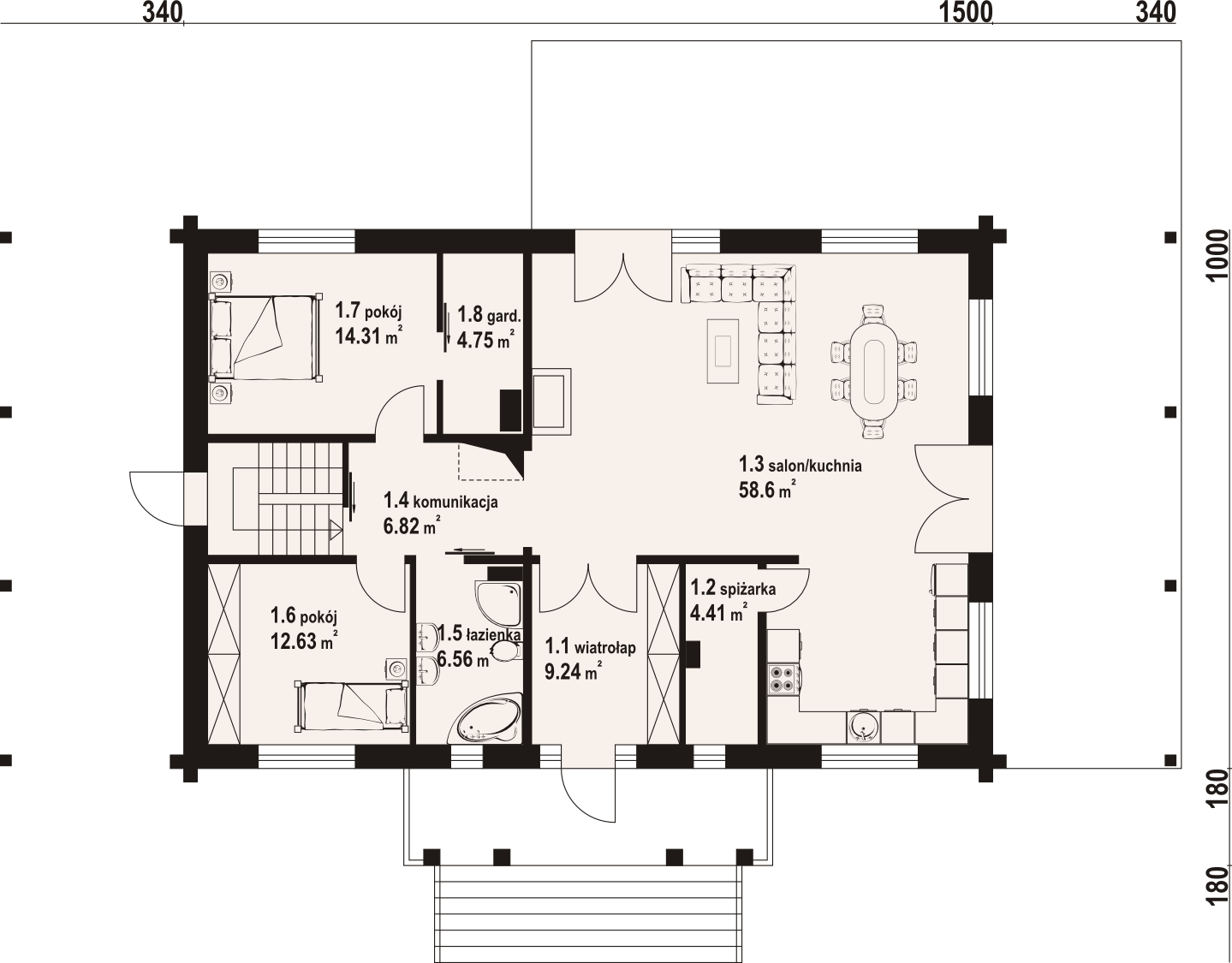 Wysokość ścianki kolankowej: 0.26 m. Strop: żelbet + drewniany. Pokrycie dachu: dachówka gontopodobna Gerard Corona. Ściany zewnętrzne: płazy drewniane + wełna mineralna + deska. Ściany wewnętrzne: płazy drewniane. Typ ogrzewania: pompa ciepła. Instalacje dodatkowe: instalacja solarna.