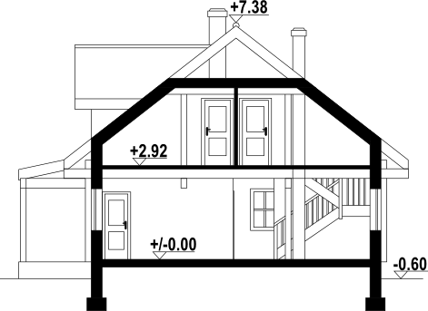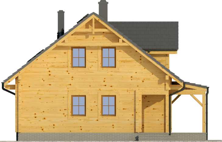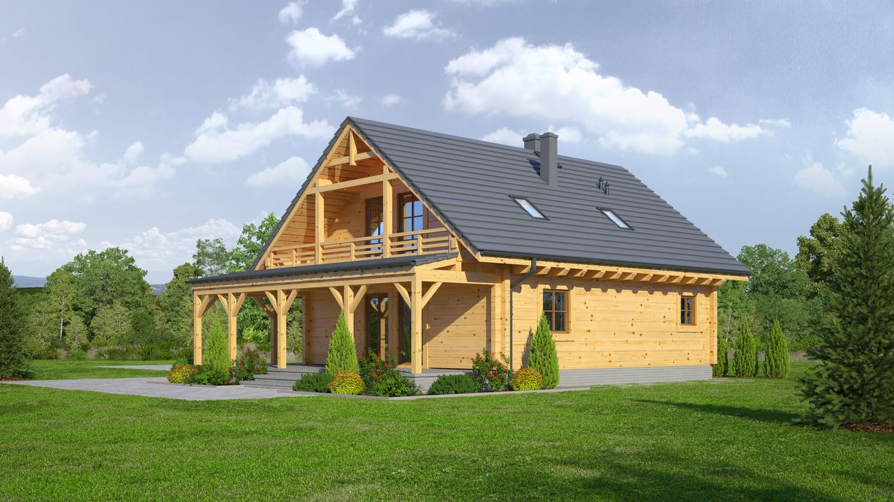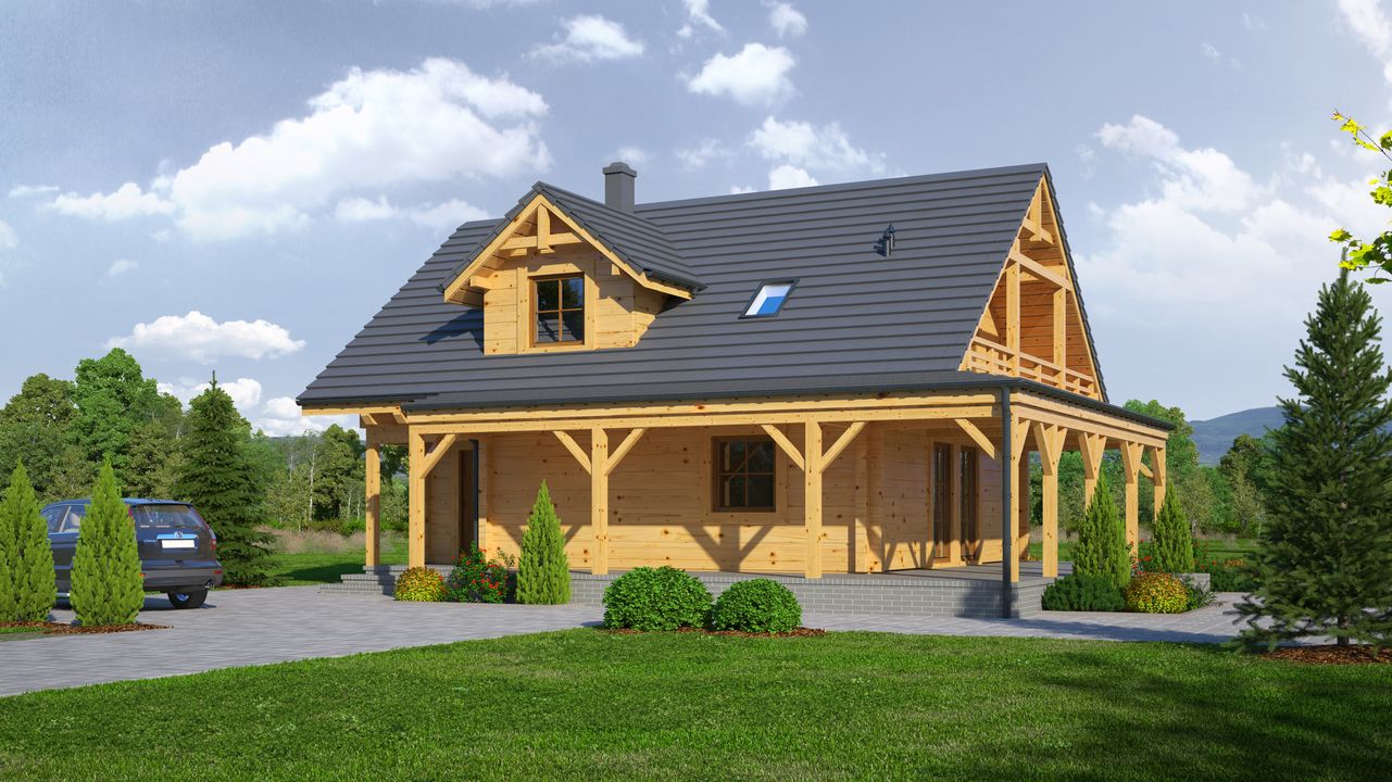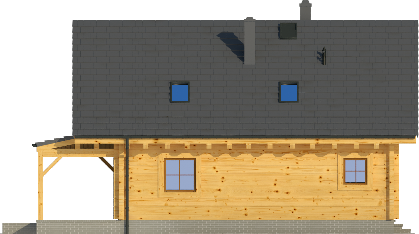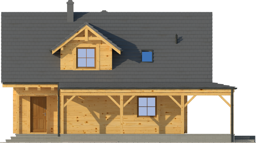Wysokość ścianki kolankowej: 0.6 m. Strop: drewniany. Pokrycie dachu: dachówka gontopodobna Gerard Corona. Ściany zewnętrzne: płazy drewniane + wełna mineralna + deska. Ściany wewnętrzne: szkieletowe drewniane. Typ ogrzewania: kocioł gazowy lub kocioł na paliwo stałe. Inne: okna połaciowe Velux.
