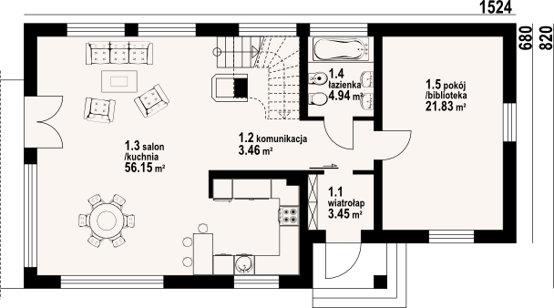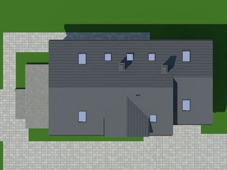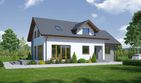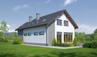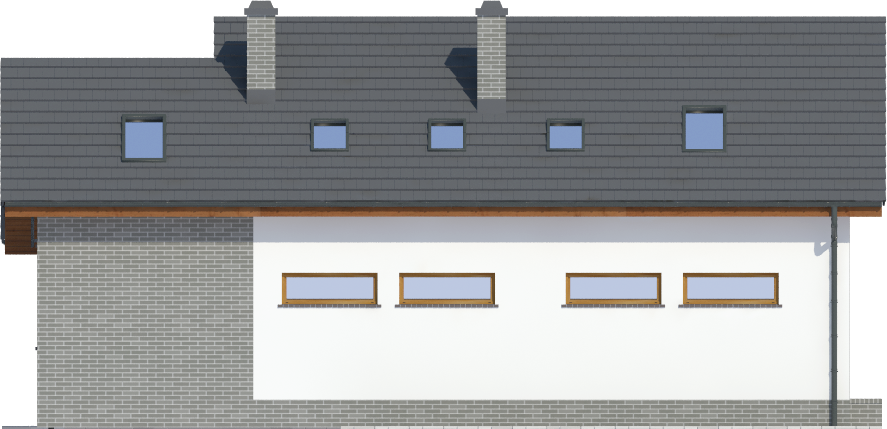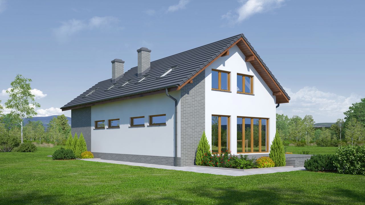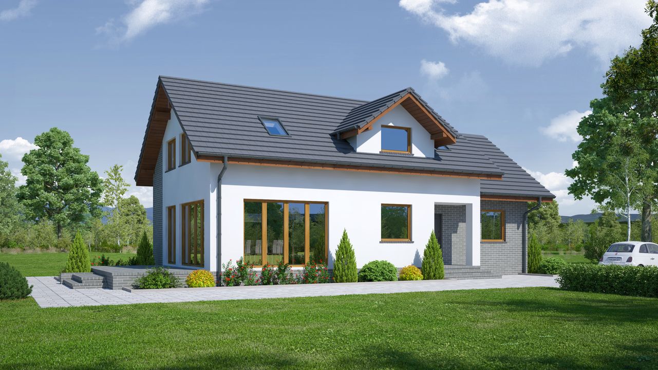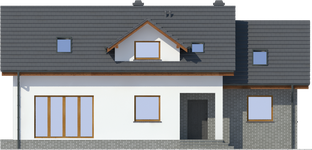 Graficzne opracowanie rzutów poglądowych widocznych na karcie projektu zostało wykonane przez Extradom.pl. Prezentowane przez Extradom.pl wizualizacje wykonane zostały przez autora projektu i należy poczytywać je jedynie za przykład i propozycję wykończenia, wizję architektoniczną autora projektu. Ostateczne wykończenie budynku może nastąpić na wiele sposobów. Szczegółowe rozwiązania zastosowane w oferowanej dokumentacji - w tym również ilość, lokalizacje i wygląd okien, drzwi, kominów - mogą w niewielkim stopniu różnić się od prezentowanej wizualizacji budynku.