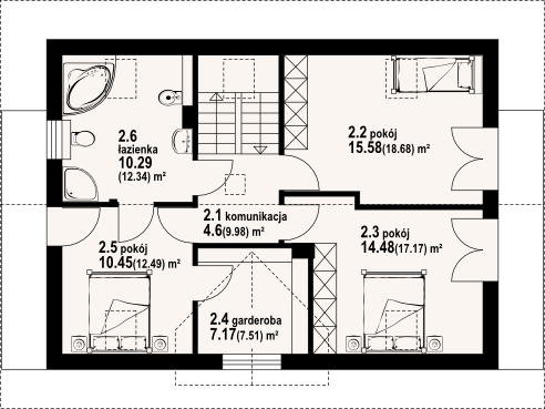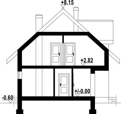 Wysokość ścianki kolankowej: 1.28 m. Strop: płyta żelbetowa. Pokrycie dachu: dachówka ceramiczna. Ściany zewnętrzne: bloczki z betonu komórkowego + styropian. Ściany wewnętrzne: bloczki z betonu komórkowego. Typ ogrzewania: kocioł na paliwo stałe. Inne: okna połaciowe Fakro.