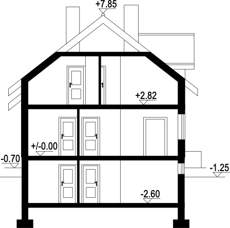 Wys. ścianki kolankowej 1.32 m Ilość drewna na więźbę 8.16 m³. Strop: płyta żelbetowa. Pokrycie dachu: dachówka ceramiczna. Ściany wewnętrzne: pustaki ceramiczne. Ściany zewnętrzne: pustaki ceramiczne + styropian. Typ ogrzewania: kocioł gazowy.