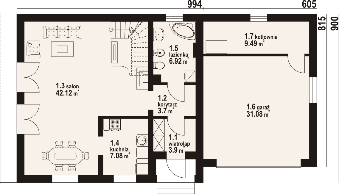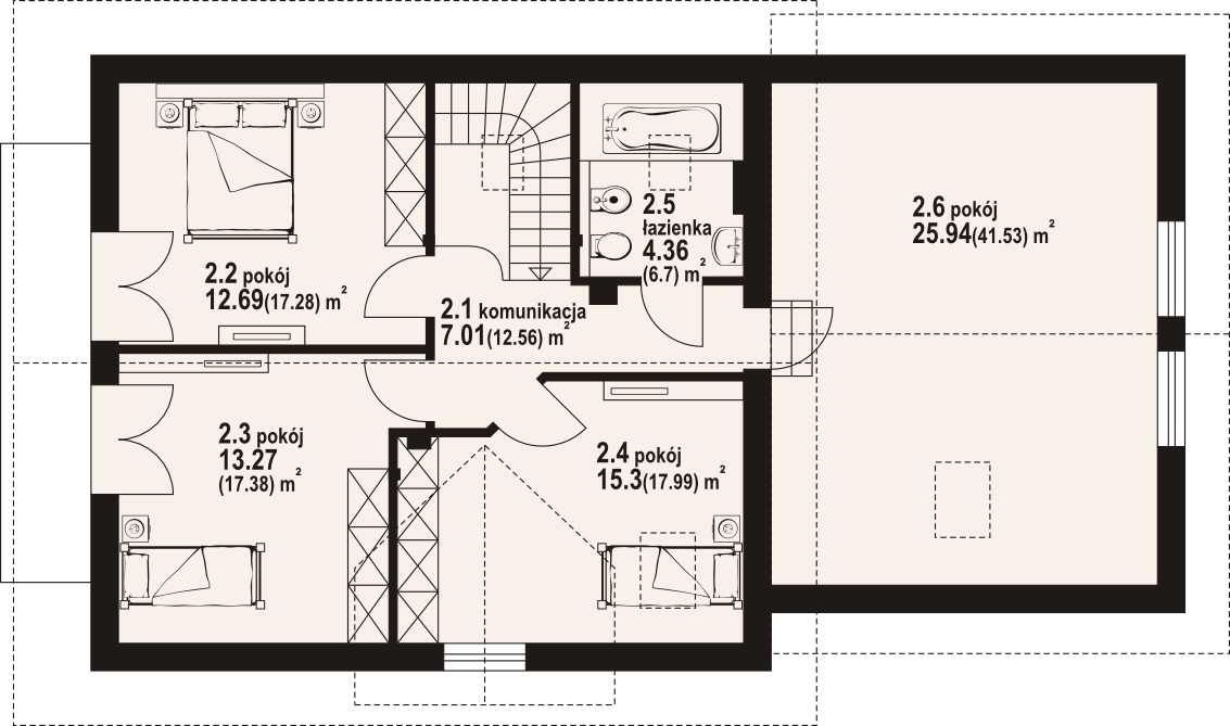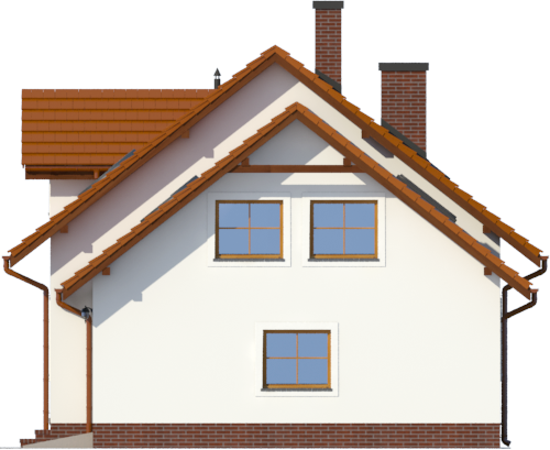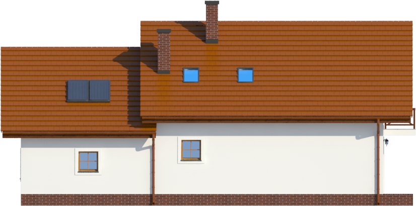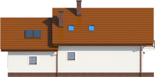 Wysokość ścianki kolankowej: 1.05 m. Strop: płyta żelbetowa. Pokrycie dachu: dachówka ceramiczna. Ściany zewnętrzne: pustaki ceramiczne + styropian. Ściany wewnętrzne: pustaki ceramiczne. Typ ogrzewania: kocioł gazowy lub kocioł na paliwo stałe. Inne: okna połaciowe Fakro.