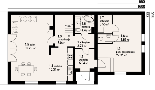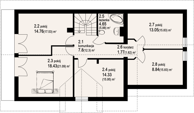 Graficzne opracowanie rzutów poglądowych widocznych na karcie projektu zostało wykonane przez Extradom.pl. Prezentowane przez Extradom.pl wizualizacje wykonane zostały przez autora projektu i należy poczytywać je jedynie za przykład i propozycję wykończenia, wizję architektoniczną autora projektu. Ostateczne wykończenie budynku może nastąpić na wiele sposobów. Szczegółowe rozwiązania zastosowane w oferowanej dokumentacji - w tym również ilość, lokalizacje i wygląd okien, drzwi, kominów - mogą w niewielkim stopniu różnić się od prezentowanej wizualizacji budynku.