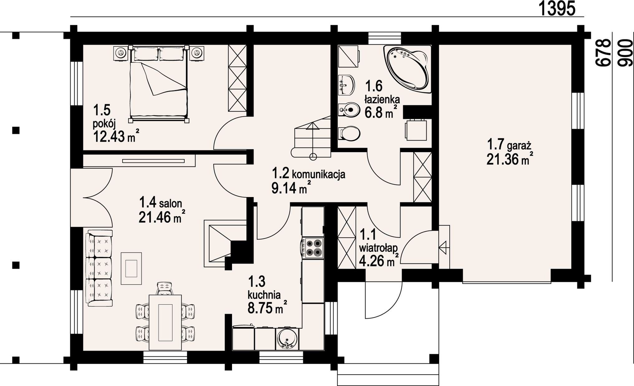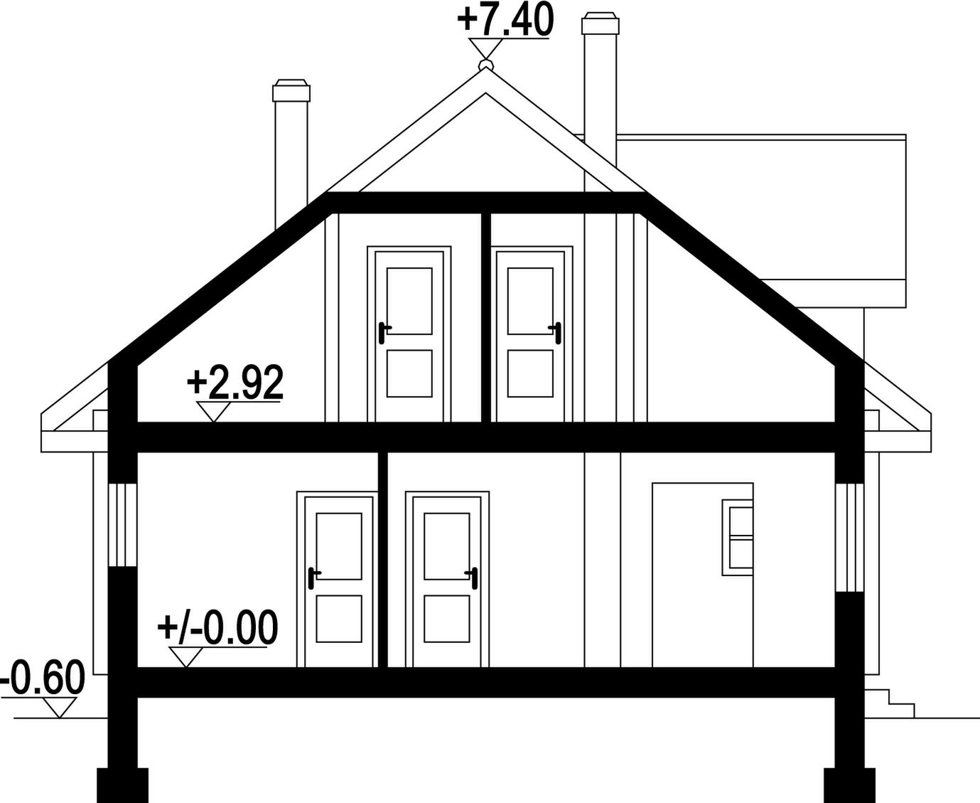 Graficzne opracowanie rzutów poglądowych widocznych na karcie projektu zostało wykonane przez Extradom.pl. Prezentowane przez Extradom.pl wizualizacje wykonane zostały przez autora projektu i należy poczytywać je jedynie za przykład i propozycję wykończenia, wizję architektoniczną autora projektu. Ostateczne wykończenie budynku może nastąpić na wiele sposobów. Szczegółowe rozwiązania zastosowane w oferowanej dokumentacji - w tym również ilość, lokalizacje i wygląd okien, drzwi, kominów - mogą w niewielkim stopniu różnić się od prezentowanej wizualizacji budynku.