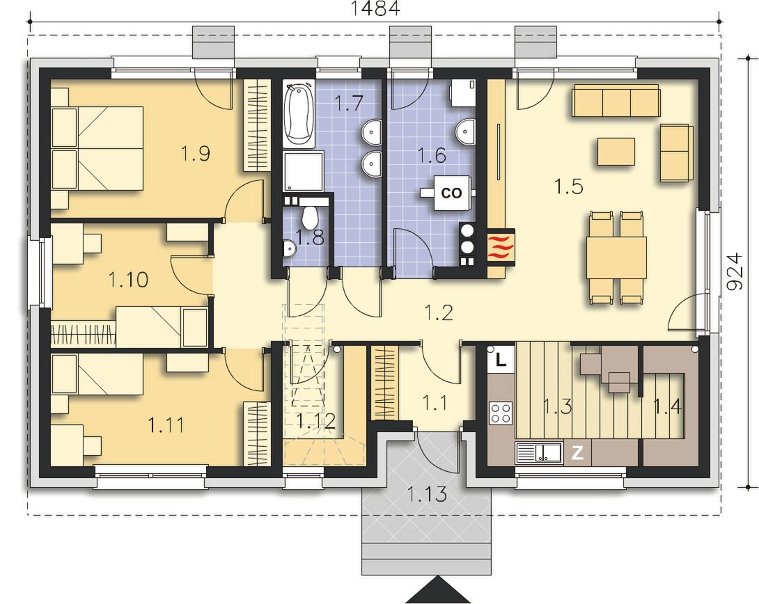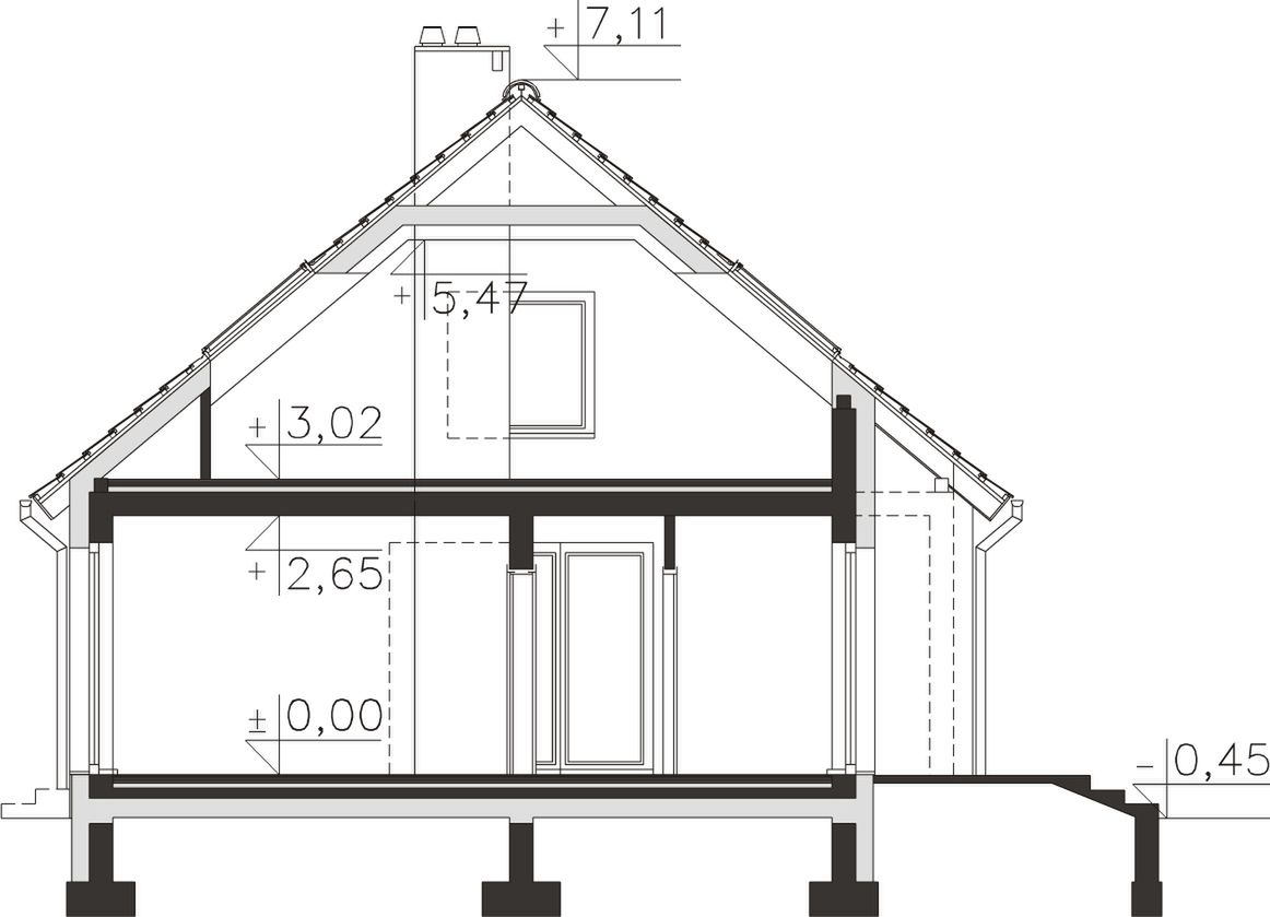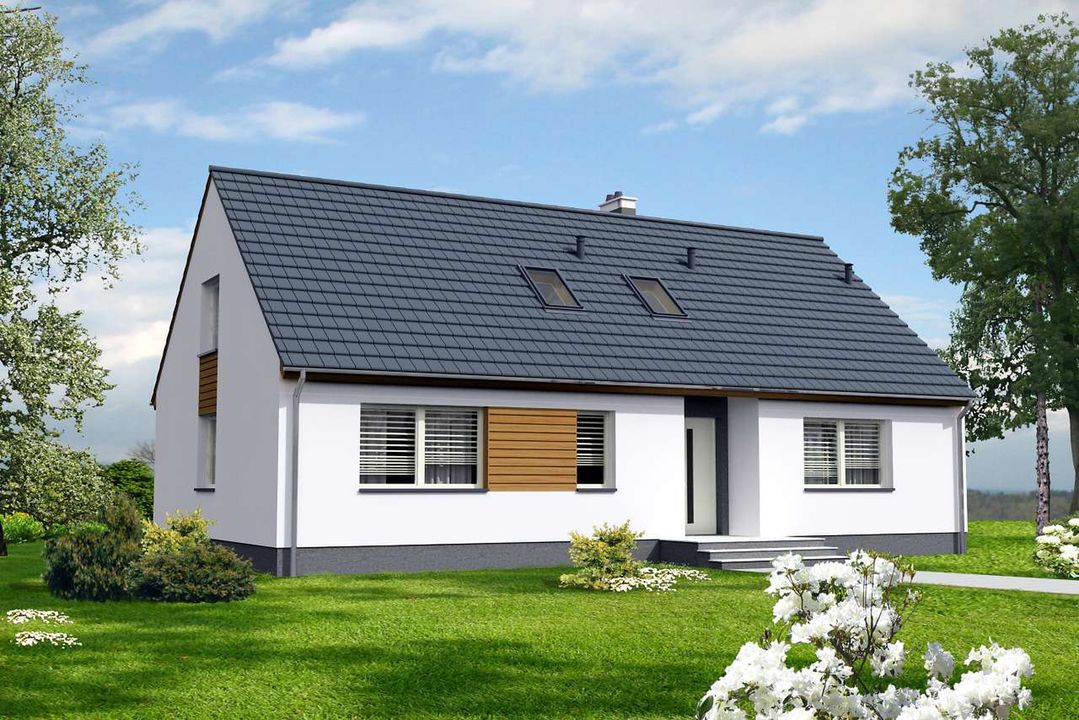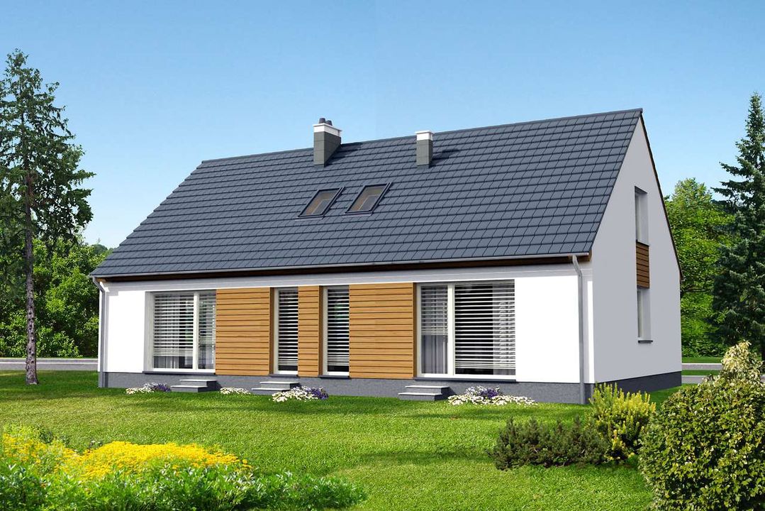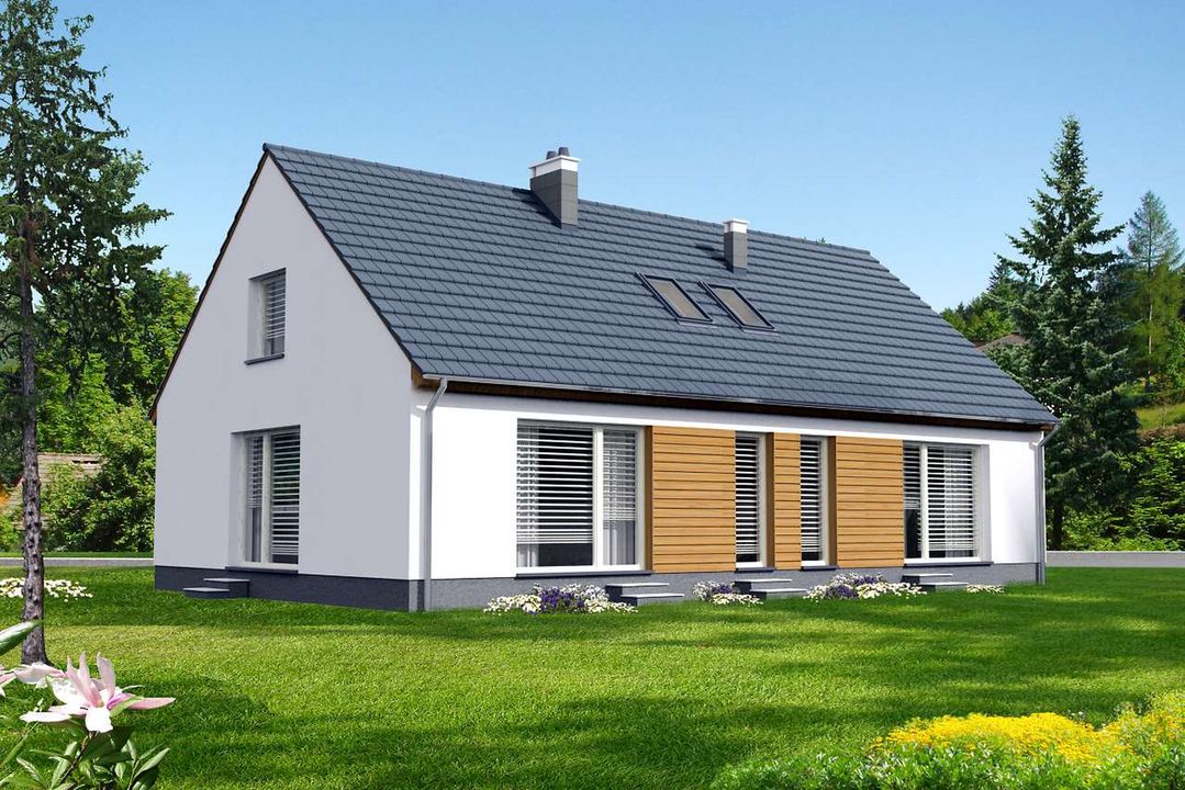 Graficzne opracowanie rzutów poglądowych widocznych na karcie projektu zostało wykonane przez Extradom.pl. Prezentowane przez Extradom.pl wizualizacje wykonane zostały przez autora projektu i należy poczytywać je jedynie za przykład i propozycję wykończenia, wizję architektoniczną autora projektu. Ostateczne wykończenie budynku może nastąpić na wiele sposobów. Szczegółowe rozwiązania zastosowane w oferowanej dokumentacji - w tym również ilość, lokalizacje i wygląd okien, drzwi, kominów - mogą w niewielkim stopniu różnić się od prezentowanej wizualizacji budynku.