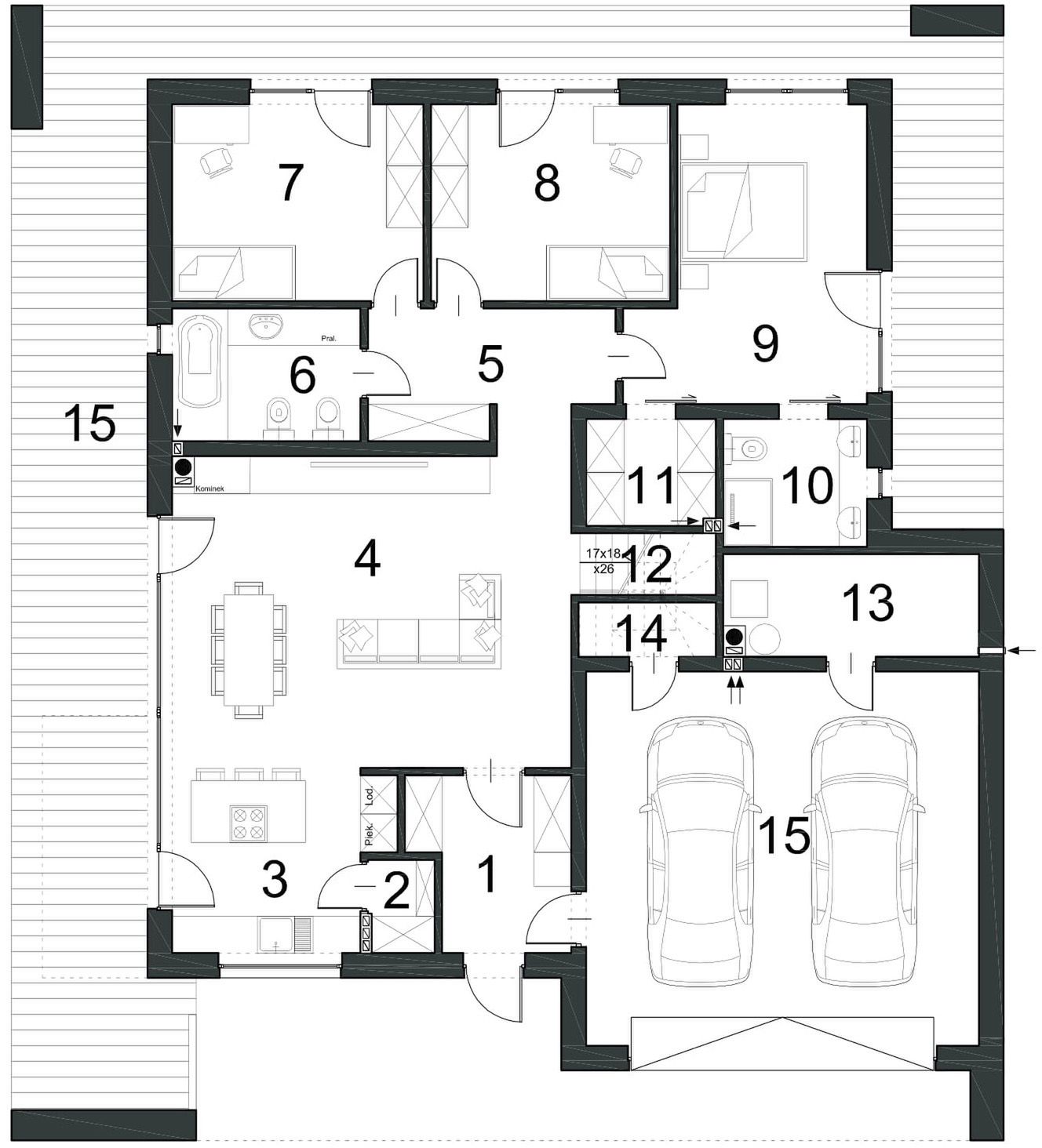 Graficzne opracowanie rzutów poglądowych widocznych na karcie projektu zostało wykonane przez Extradom.pl. Prezentowane przez Extradom.pl wizualizacje wykonane zostały przez autora projektu i należy poczytywać je jedynie za przykład i propozycję wykończenia, wizję architektoniczną autora projektu. Ostateczne wykończenie budynku może nastąpić na wiele sposobów. Szczegółowe rozwiązania zastosowane w oferowanej dokumentacji - w tym również ilość, lokalizacje i wygląd okien, drzwi, kominów - mogą w niewielkim stopniu różnić się od prezentowanej wizualizacji budynku.