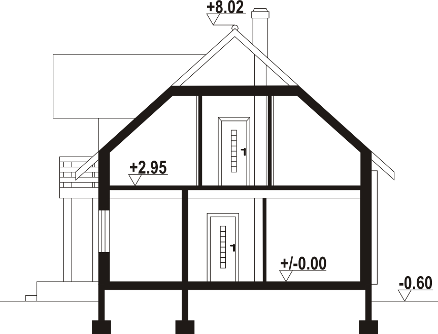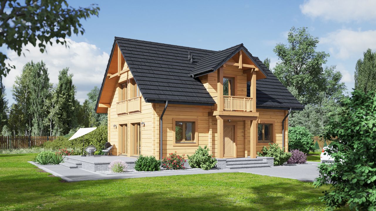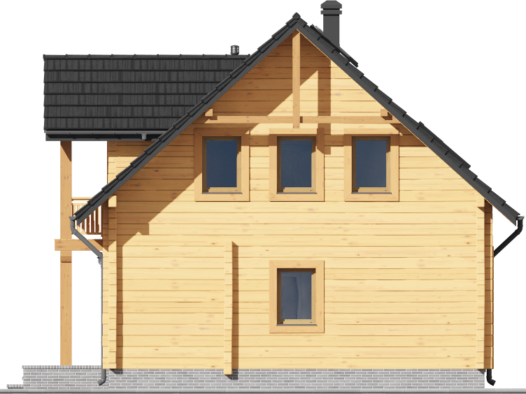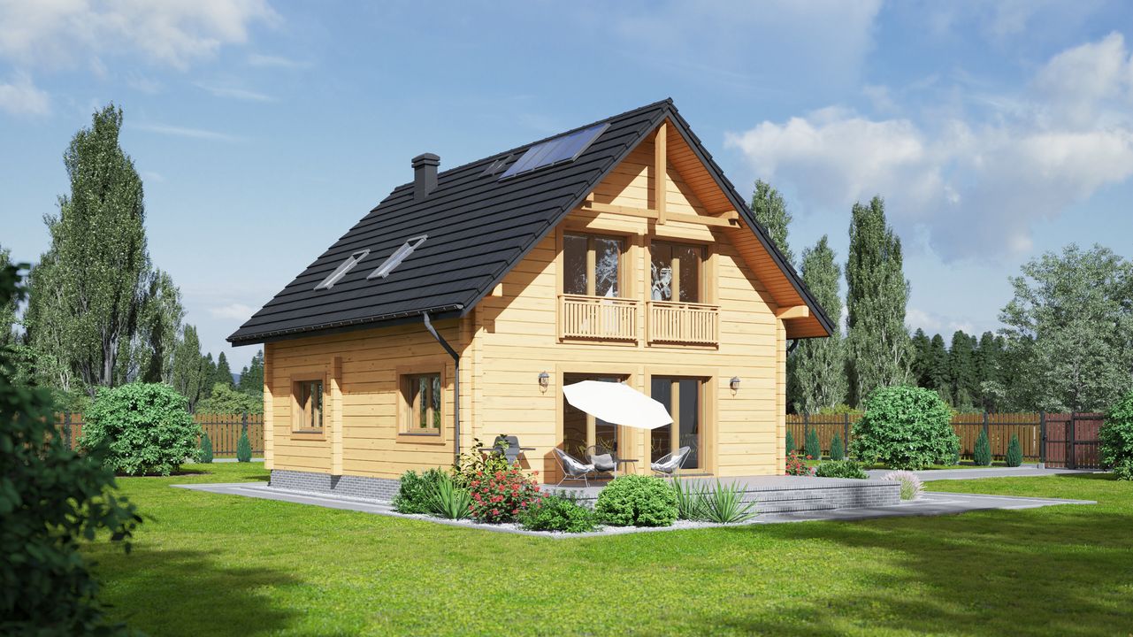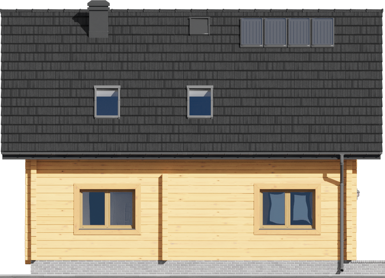 Wysokość ścianki kolankowej: 0.94 m. Strop: drewniany. Pokrycie dachu: dachówka gontopodobna Gerard Corona. Ściany zewnętrzne: płazy drewniane + wełna mineralna + deska. Ściany wewnętrzne: płazy drewniane. Typ ogrzewania: kocioł gazowy. Instalacje dodatkowe: instalacja solarna.